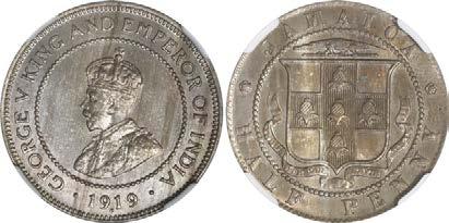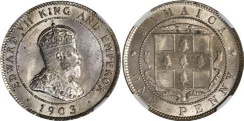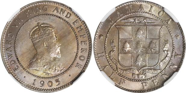1883. JAMAICA, copper-nickel half penny, Edward VII, 1906, NGC MS 64, ex-Rudman. KM-22. Tied with one other for second finest in the NGC census behind a single MS 65. Lustrous example with lightly golden-toned obverse and richer-toned reverse. NGC #3236017-035. Pedigreed to the Isaac Rudman Collection (stated on label). Estimate: $100-$150.