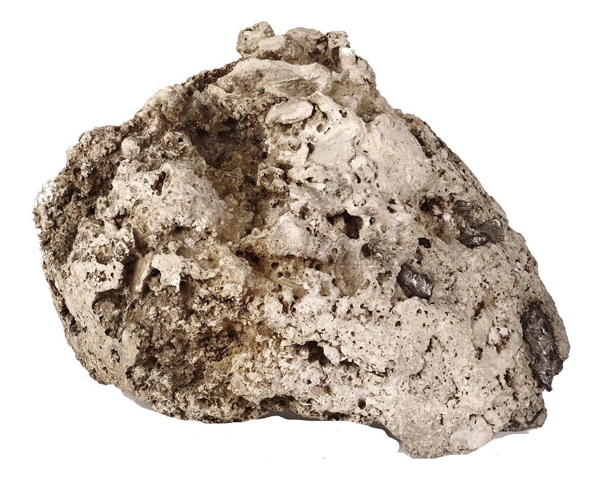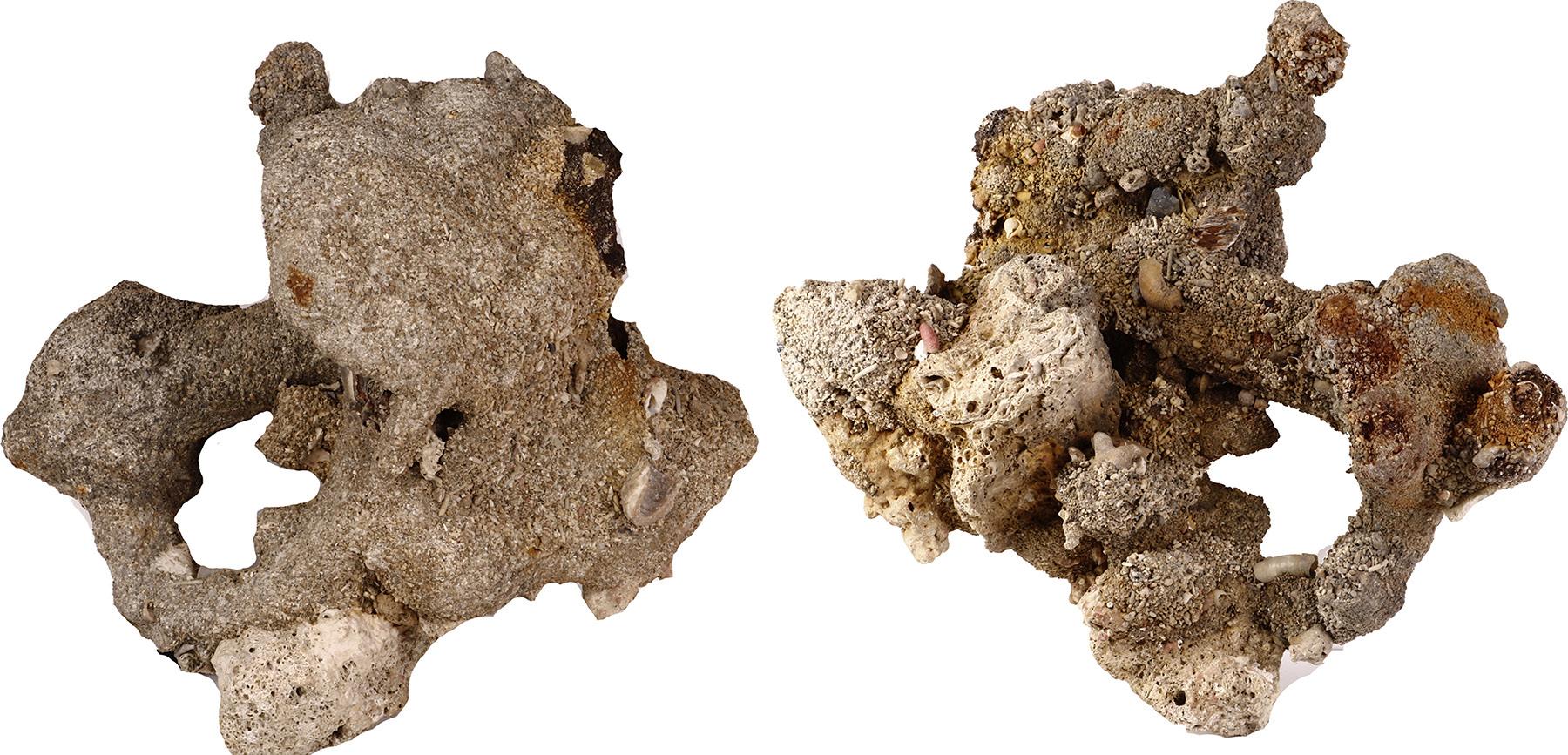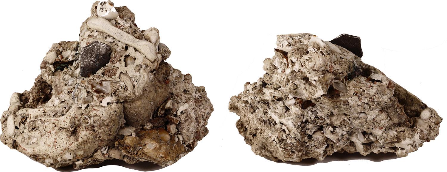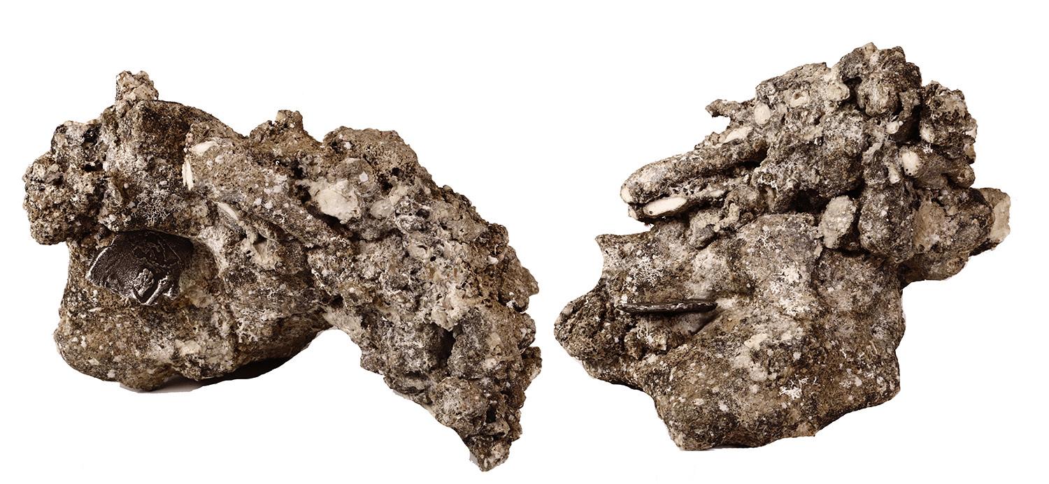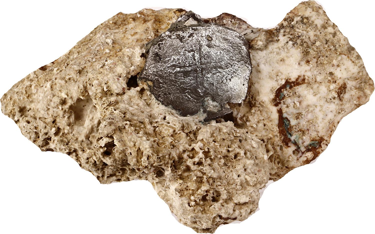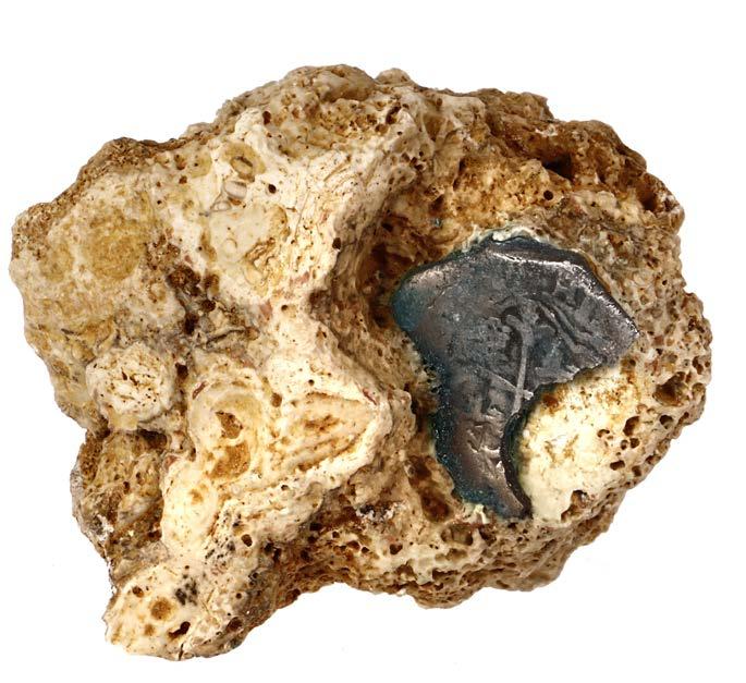 1940. Ballast stone with coral encrustation, ex-Concepción (1641). 1110 grams total. Roughly 6” x 4½” x 2½”. Mostly oval-shaped with concretion jutting out from one side, a porous and rather lightweight rock with light-colored speckles of sedimentation all over, the dark honeycombed stone peeking out. From the Concepción (1641), with original certificate from Captain Tracy Bowden through his contract with the Dominican Republic, and accompanied by the July 1996 issue of National Geographic signed by Captain Tracy Bowden on his article “Gleaning Treasure from the Silver Bank.” Estimate: $50-$75.