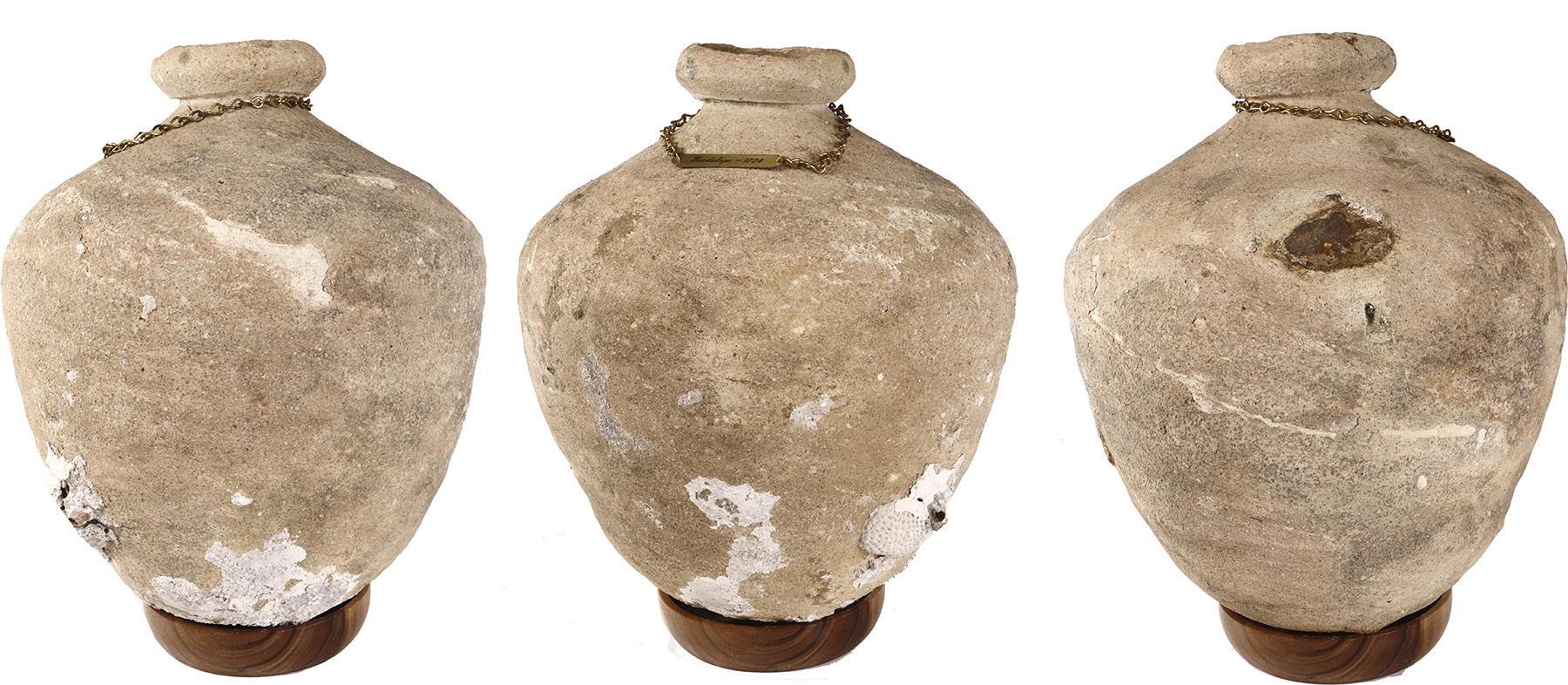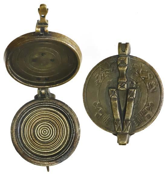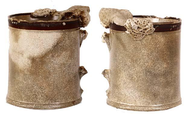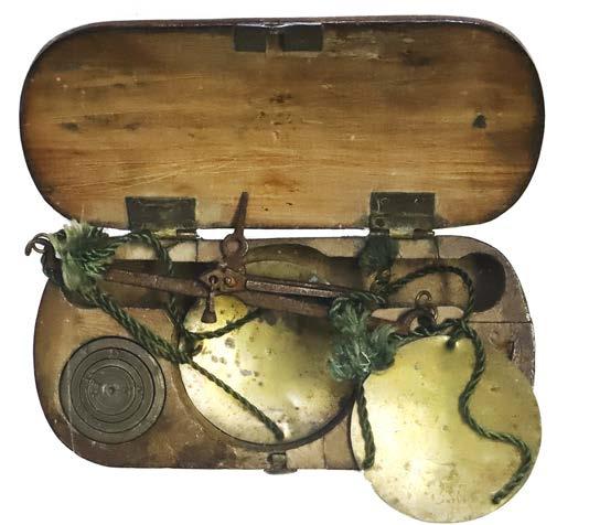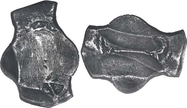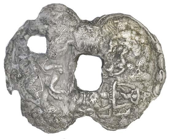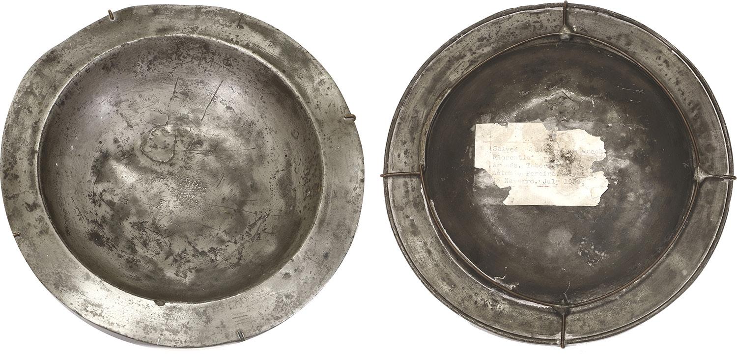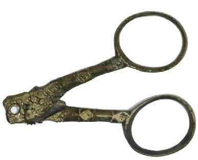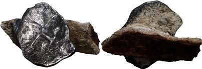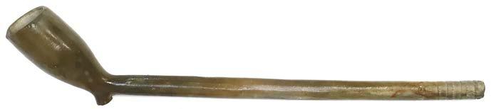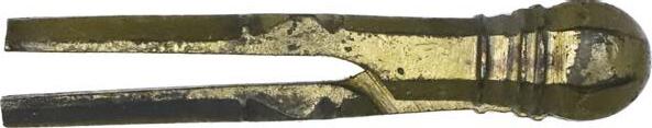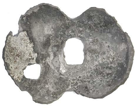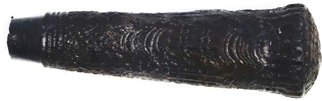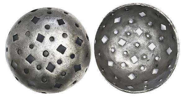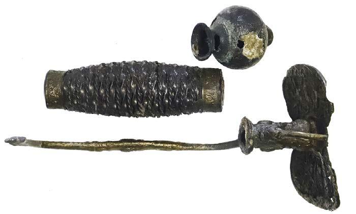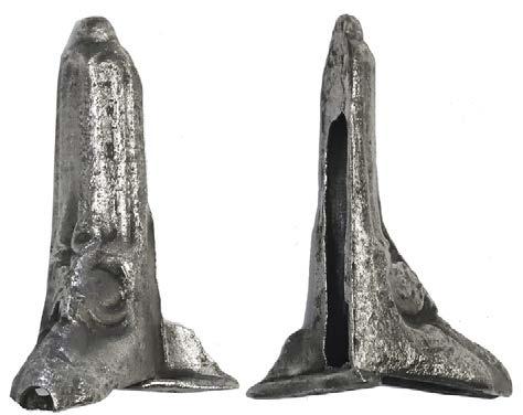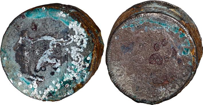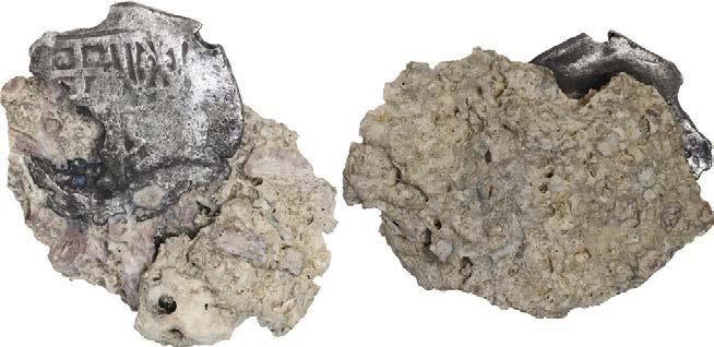 1942. Brass powder-flask spout and base (two pieces), exGuadalupe-Tolosa (1724). 117 grams total. Flask is 2½” long and base is 2¼” in diameter. The leather bag long gone, what remains are a simple, deeply patinated spout and base, no ornamentation but clearly recognizable as the important parts of a powder and shot flask. From the GuadalupeTolosa (1724), with original certificate from Captain Tracy Bowden through his contract with the Dominican Republic and copy of the article “Graveyard of the Quicksilver Galleons” by Mendel Peterson from the December 1979 issue of National Geographic Estimate: $125-$200.