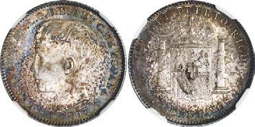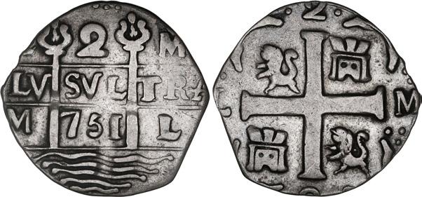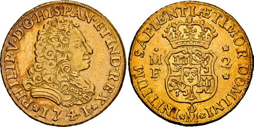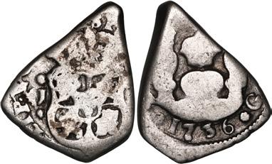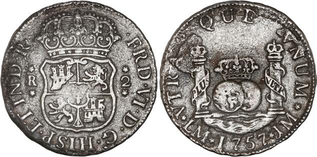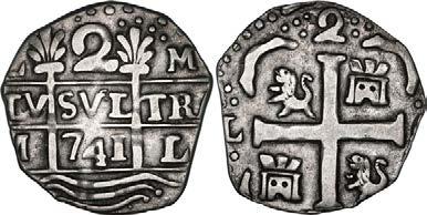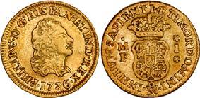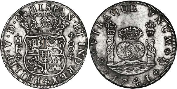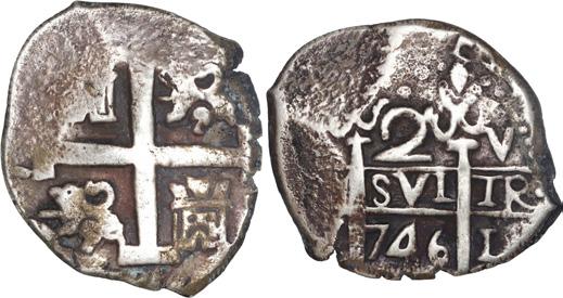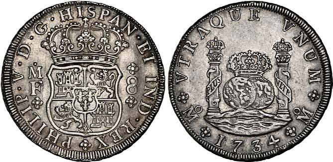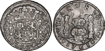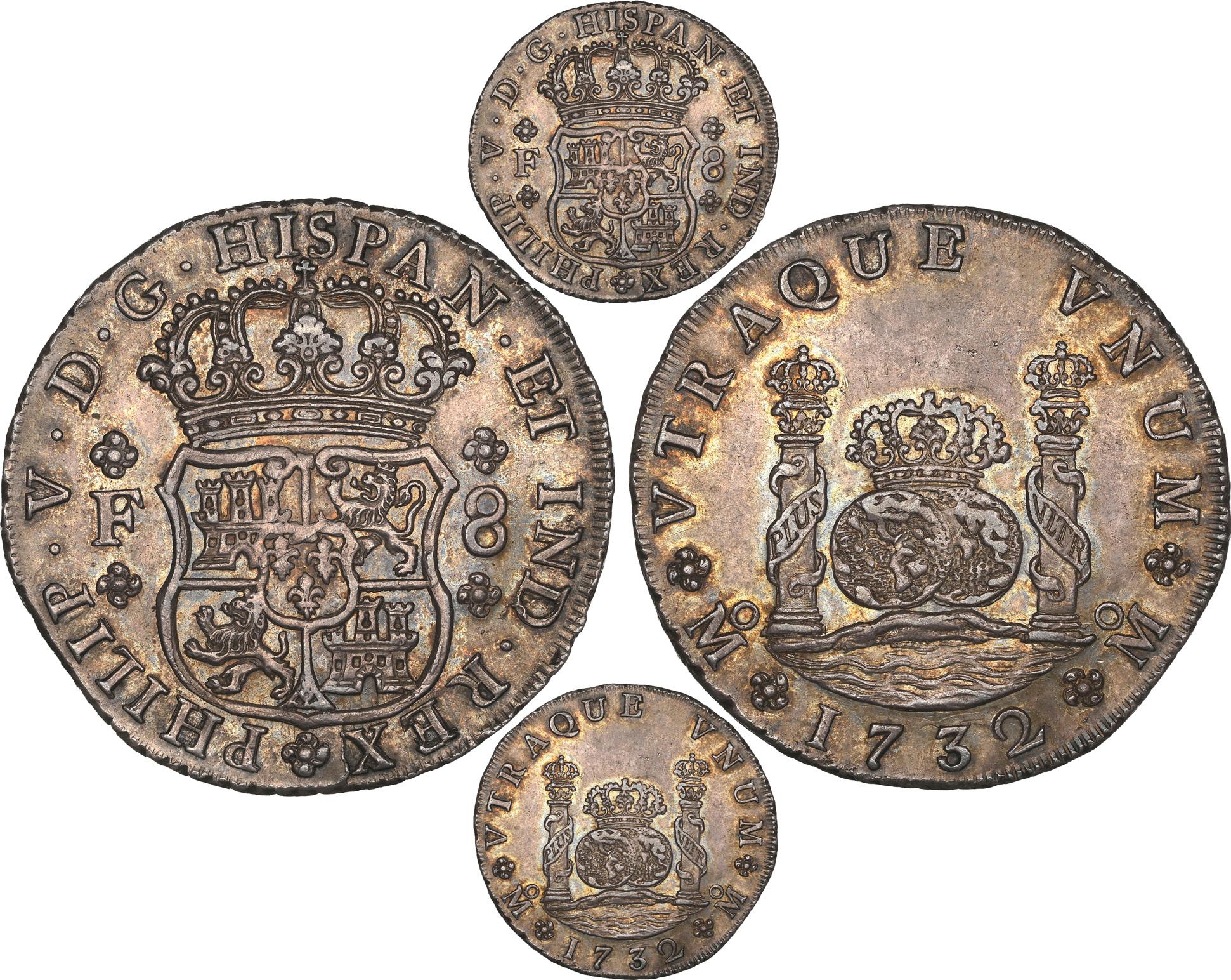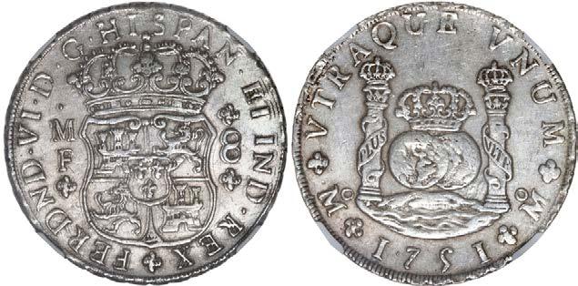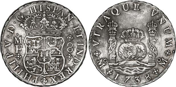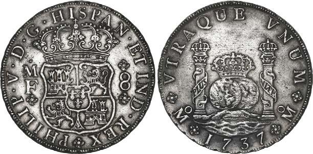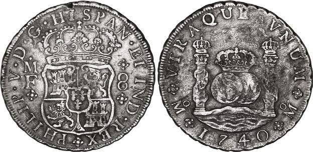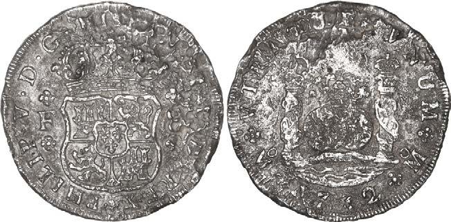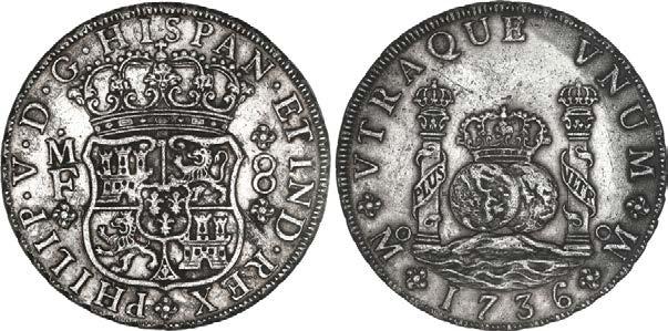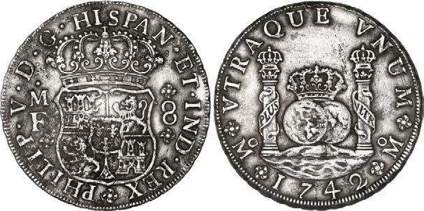 1891. MEXICO, Mexico City, pillar 2 reales, Philip V, 1746 M. Yonaka-M2.46; Cal-836; KM-85. 6.71 grams. AU- with lustrous, rainbow toned shield side, pillars side with steely gray-toned fields, some light hairlines from past cleaning. Estimate: $175-$250. 1892. MEXICO, Mexico City, pillar 1 real, Philip V, 1746 M. Yonaka-M1.46c; Cal-524; KM-75.2. 3.30 grams. Type with weak crossbar in H of HISP that Yonaka suggests came from a broken H punch being crudely repaired. XF with richly toned fields, a few errant surface hairlines. Estimate: $125-$200.