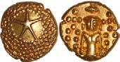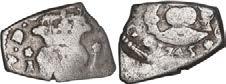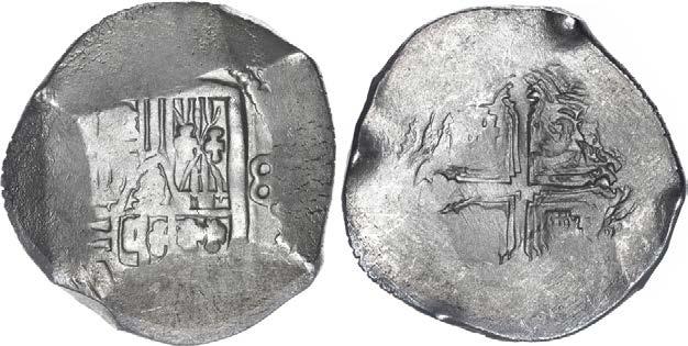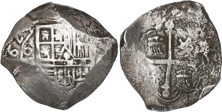 8. SPAIN, Seville, gold cob 8 escudos, Philip IV, assayer R (style of 1660s). Cal-Type 406; KM112; Fr-200. 26.47 grams. Bold full cross and shield, crude peripheries due to uneven thickness, light yellow color with tinge of red toning in crevices, marks on edge as ex-jewelry, otherwise AU. Estimate: $6,000-$9,000.