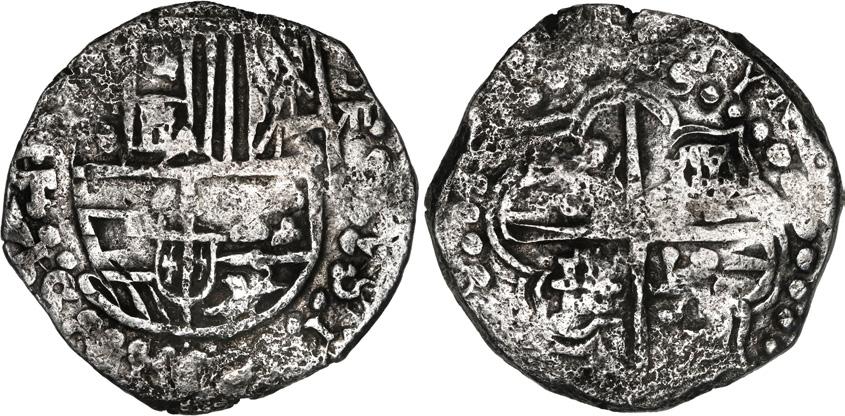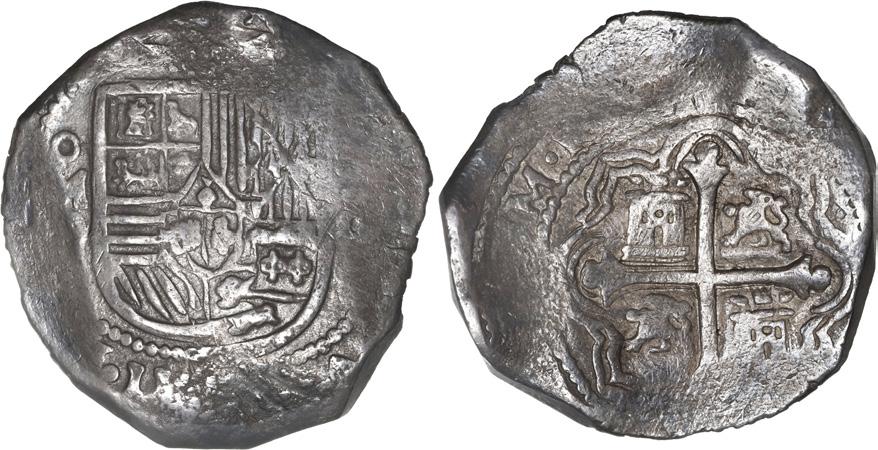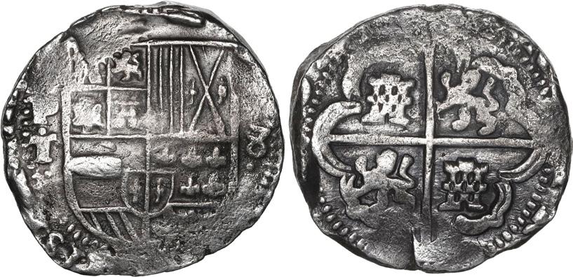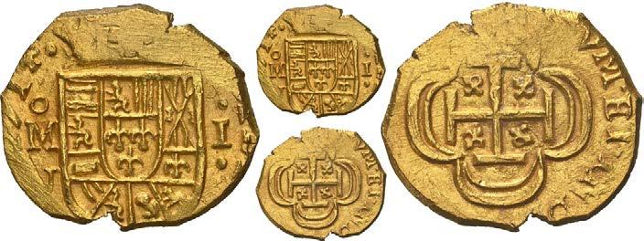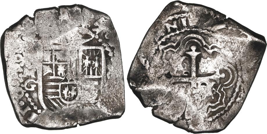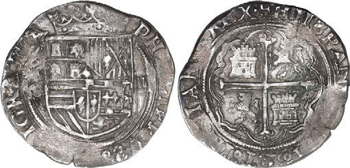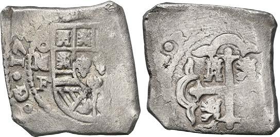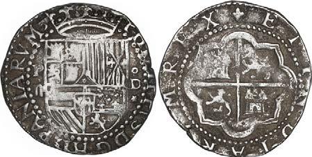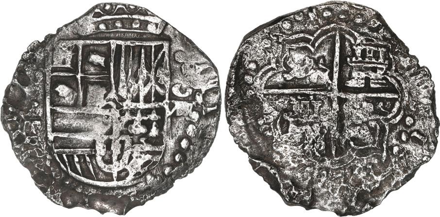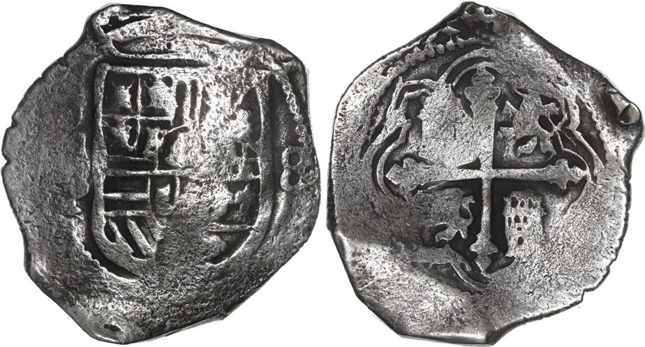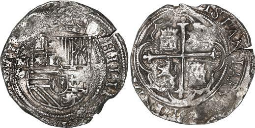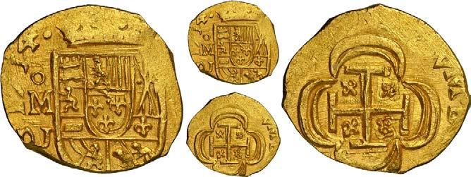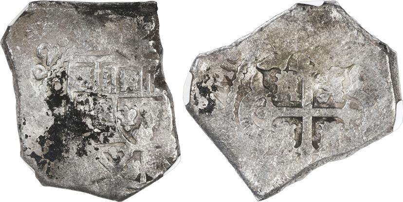 6. SPAIN, Toledo, gold cob 2 escudos, Philip II, assayer M-in-circle below mintmark oT to left, NGC AU 55. Cal-865; Fr-170. 6.66 grams. Nice luster, choice full crossand-tressure, bold full denomination II with two dots above to right of well-detailed full shield, the oT and M-in-circle to right also clear, some legend but overall a smallish flan for the type. NGC #8413192-002. Estimate: $3,000-$4,500.