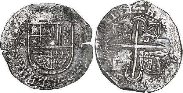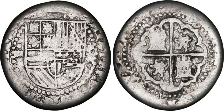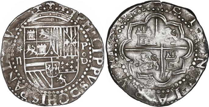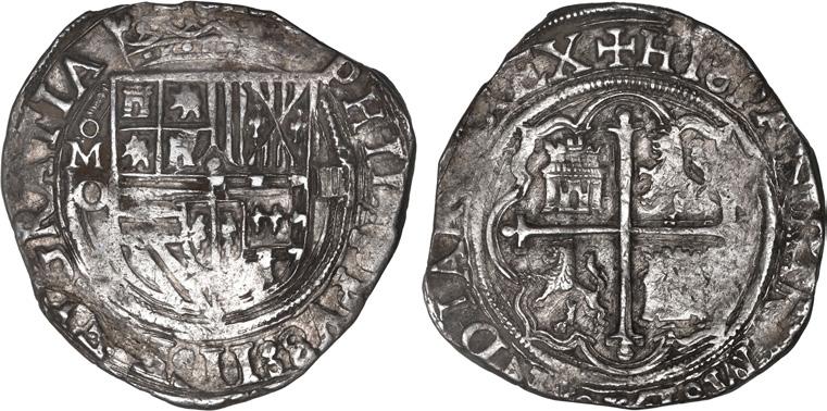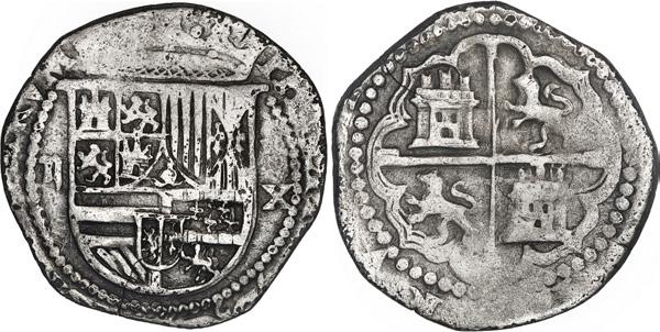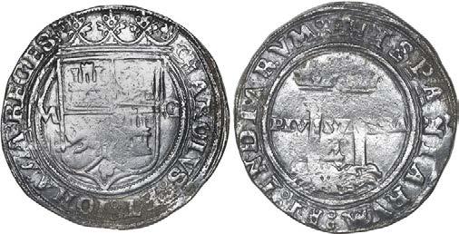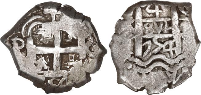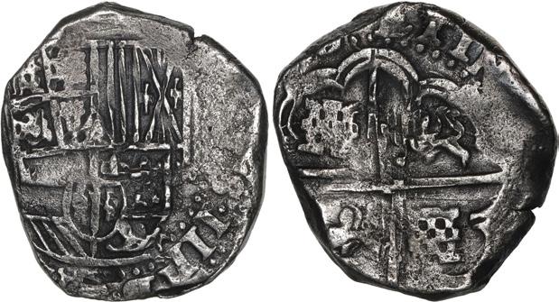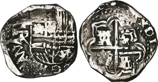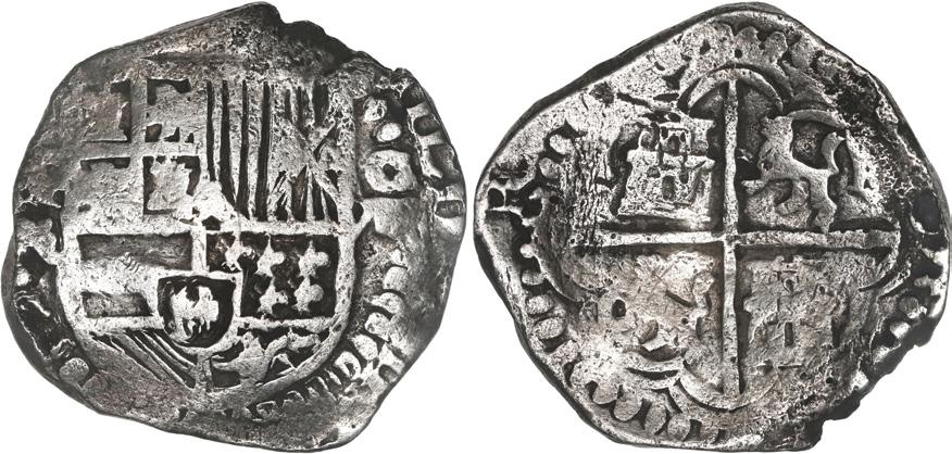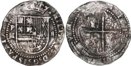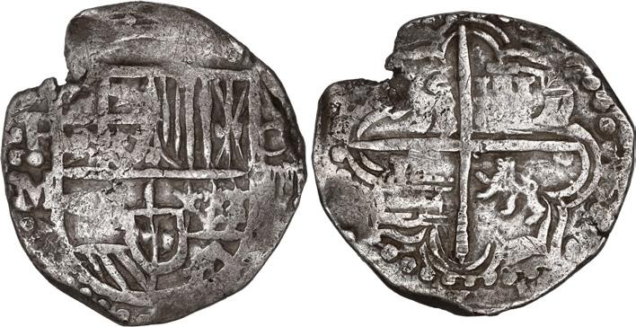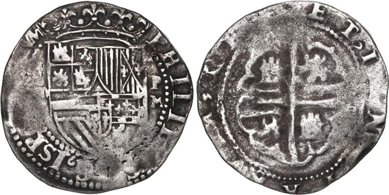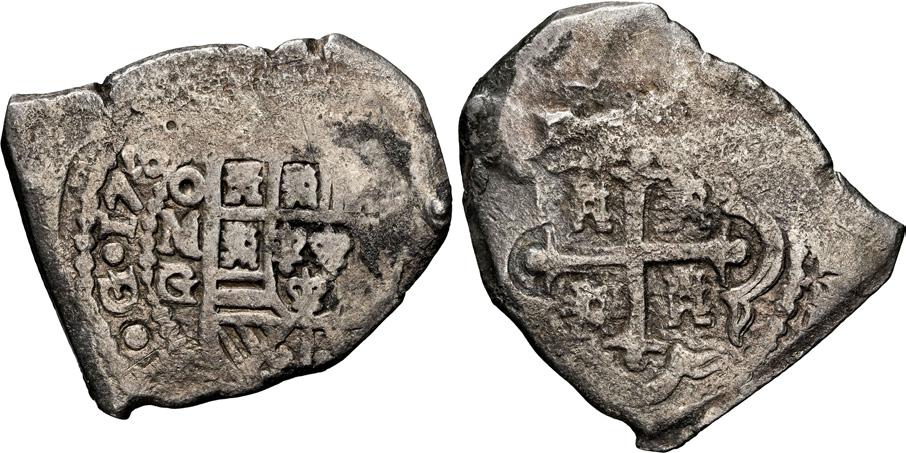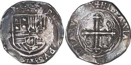 6. SPAIN, Toledo, gold cob 2 escudos, Philip II, assayer M-in-circle below mintmark oT to left, NGC AU 55. Cal-865; Fr-170. 6.66 grams. Nice luster, choice full crossand-tressure, bold full denomination II with two dots above to right of well-detailed full shield, the oT and M-in-circle to right also clear, some legend but overall a smallish flan for the type. NGC #8413192-002. Estimate: $3,000-$4,500.