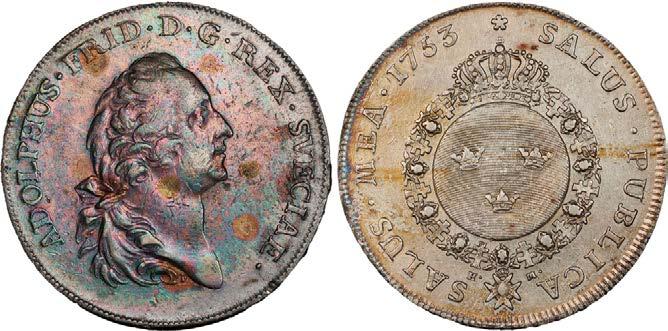 1922. SWEDEN, Stockholm, riksdaler, Gustav III, 1776OL. Dav-1735; KM-514. 29.16 grams. Popular date as the year of U.S. independence and featuring the bust of Gustav III “The Enlightened Despot” of Sweden who was assassinated in 1792. XF with nice blue and gold toning highlights around the design elements, fairly lustrous fields with light surface hairlines. Pedigreed to the Worldwide Coins of California auction of November 2016, with original lot-tag 128. Estimate: $200-$300.