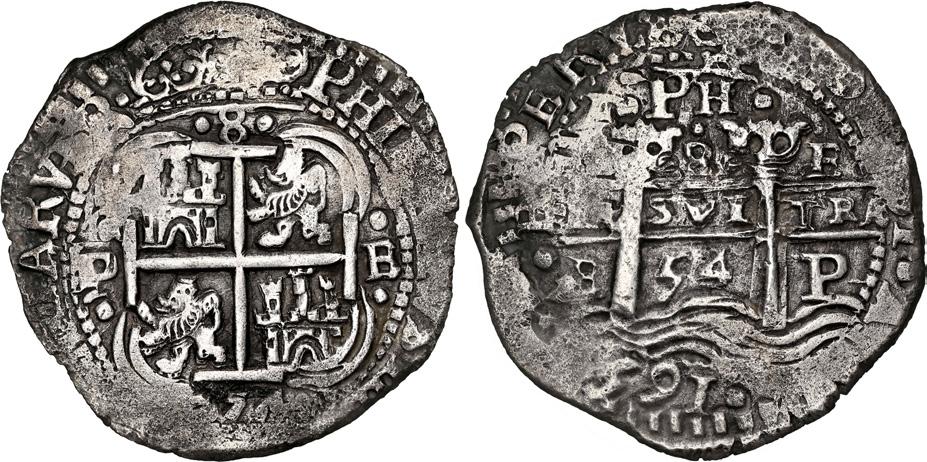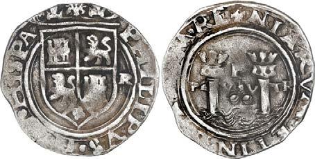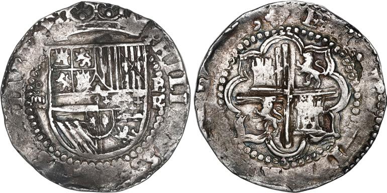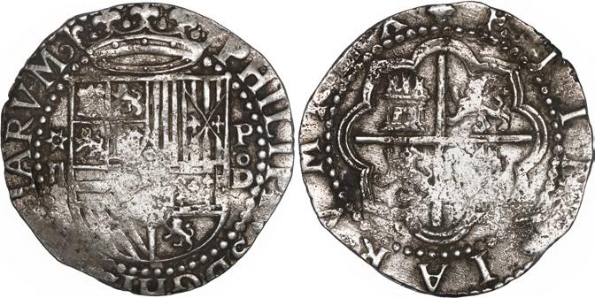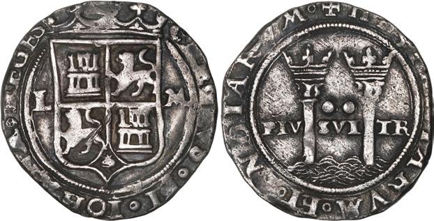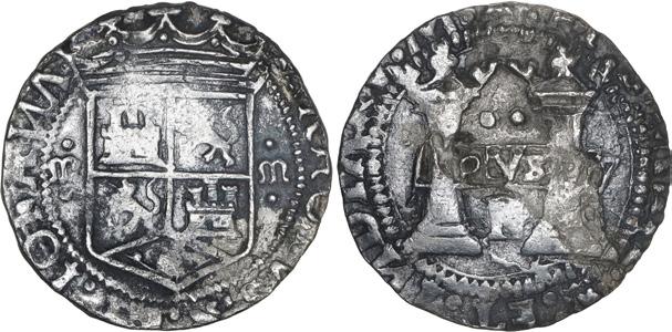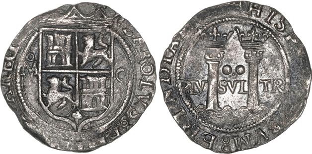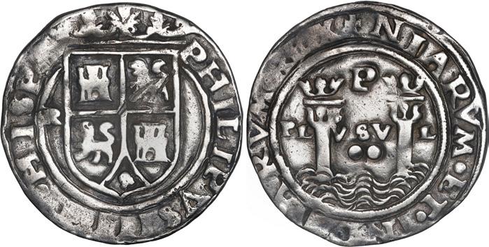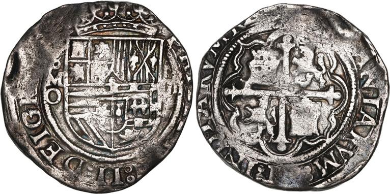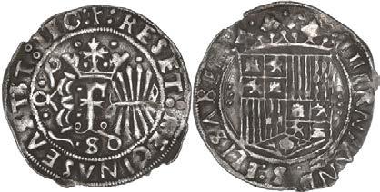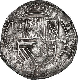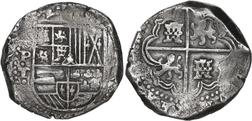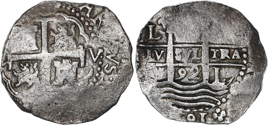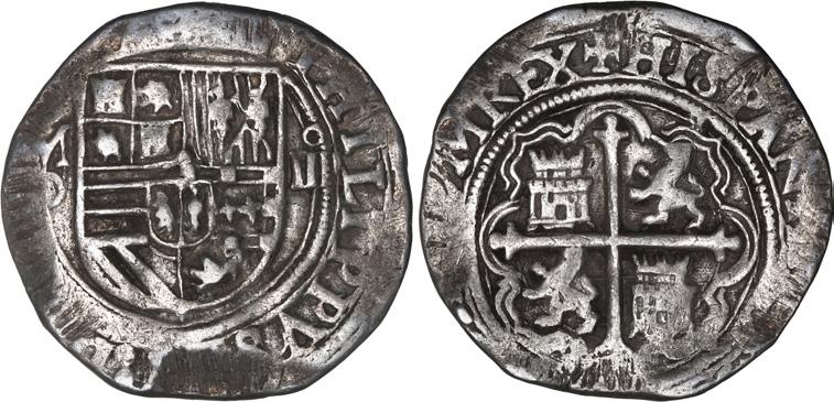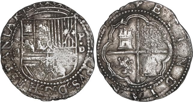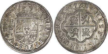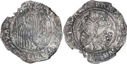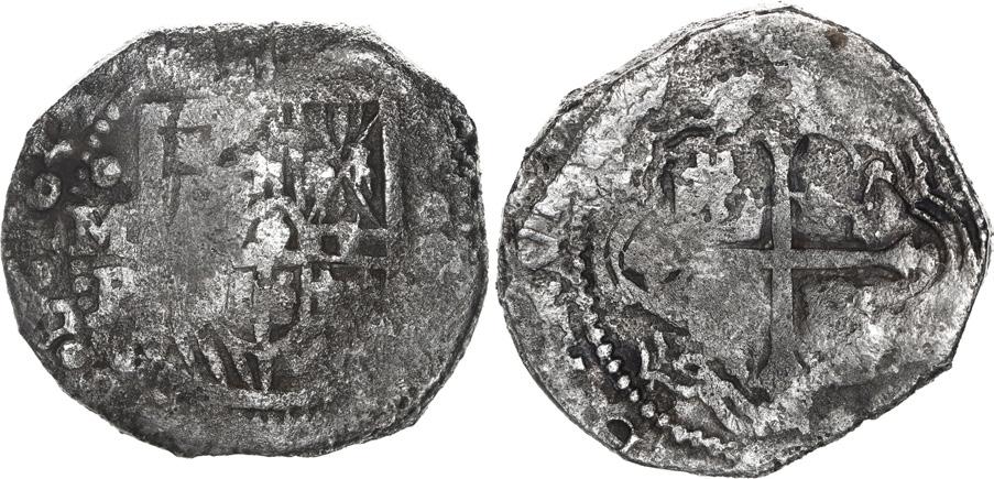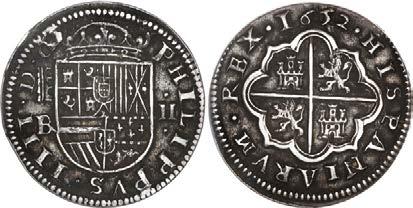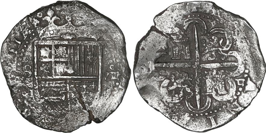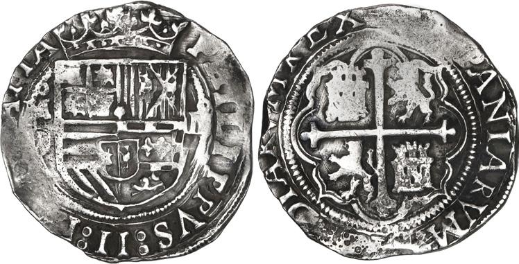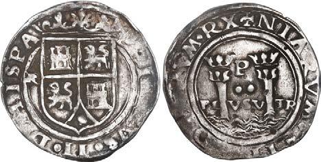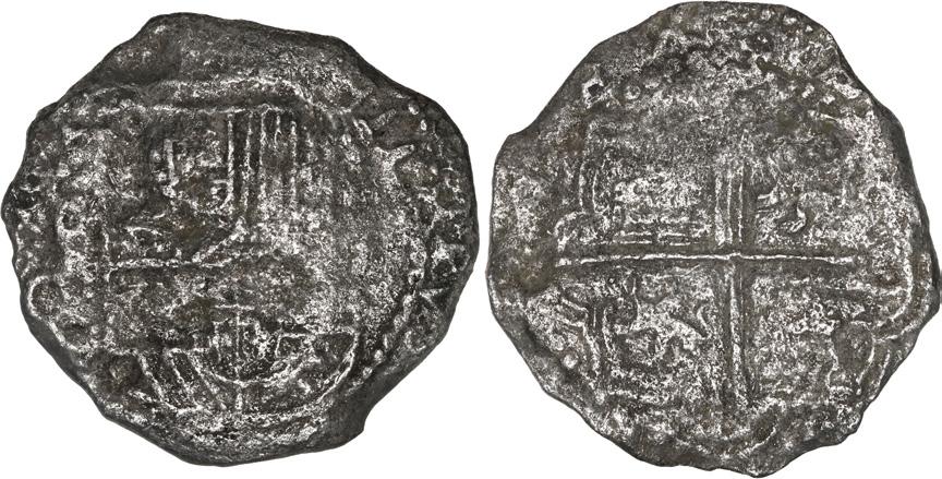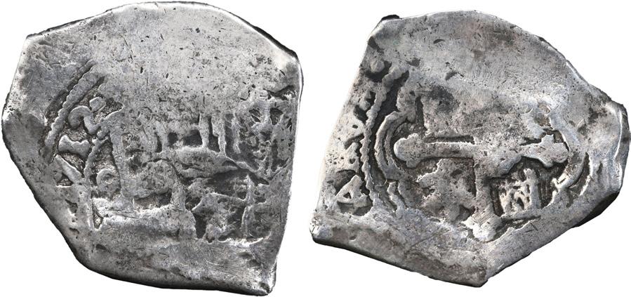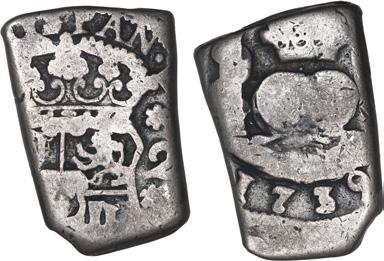 1919. SPAIN, Toledo, 1 real, Ferdinand-Isabel, assayer + at top, +T mintmark below arrows on reverse. López de la Fuente-F7.3.3.1; Cal-467. 3.07 grams. Toned XF with full design and complete legends, a few surface marks. Estimate: $125-$200. 1920. SPAIN, Seville, cob 8 reales, Philip IV, assayer D. Cal-Type350; KM-80. 27.21 grams. VF, struck on a thick, irregularly shaped flan with bold partial shield and cross, some legend detail, somewhat lustrous with faint golden toning in the fields. Estimate: $200-$300. 1921. SPAIN, Segovia, milled 2 reales, Philip V, 1722 F. Cal956; KM-297. 4.85 grams. VF with a well-centered strike, gray-toned fields with lighter high points. Estimate: $100-$150.