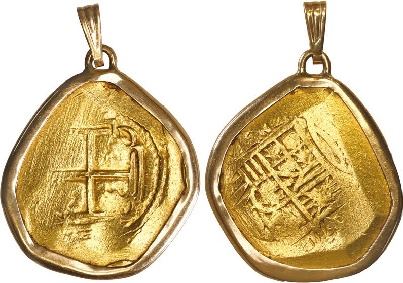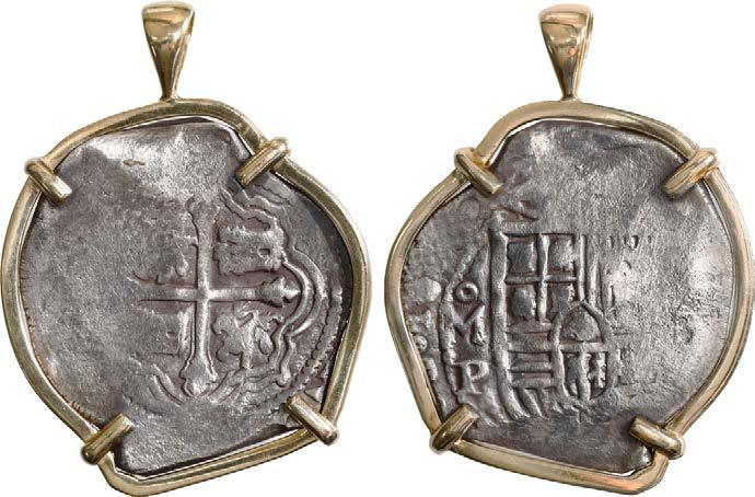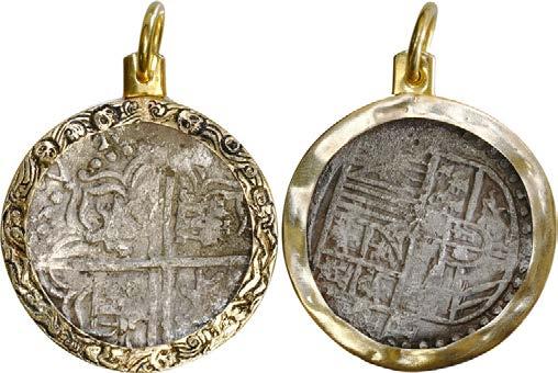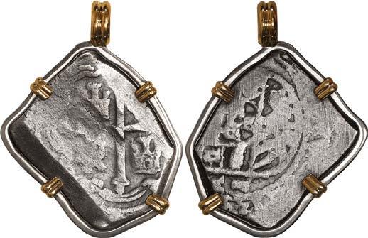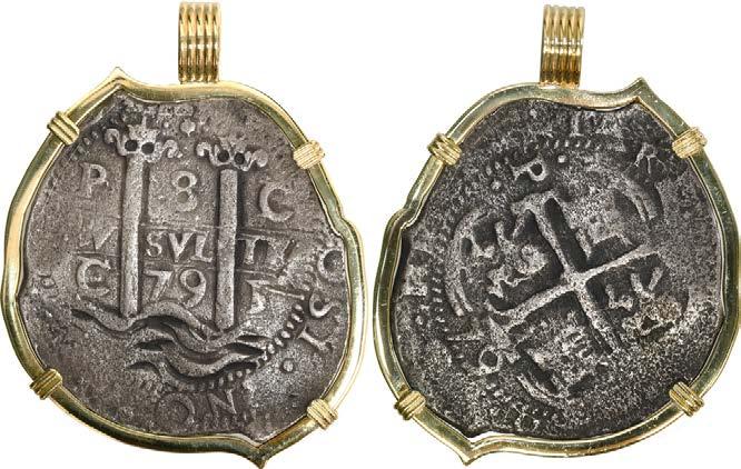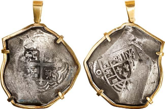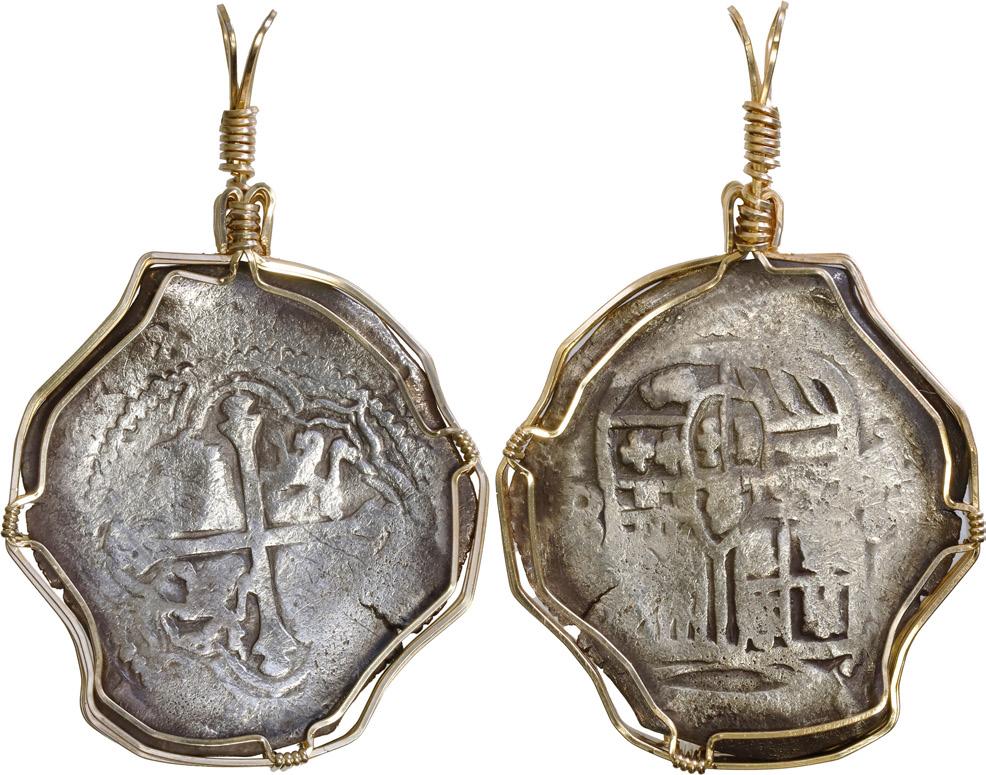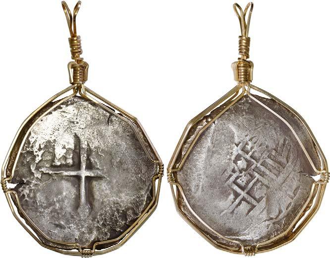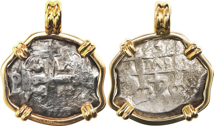 1933. MEXICO, Mexico City, cob 8 reales, Philip V, assayer not visible (J), style of 1705-12, ex-1715 Fleet, mounted cross-side out in 14K gold bezel with shackle bail and embellishments. 36.07 grams total. Very broad cob with bold partial cross and shield amidst flat peripheries, nice condition with minimal surface corrosion, set in a unique mount with dolphins and waves embellishments. From the 1715 Fleet, with photo-certificate. Estimate: $700-$1,000. 1934. MEXICO, Mexico City, cob 1 real, Philip V, assayer not visible, ex-1715 Fleet, mounted cross-side out in 14K gold wire pendant with shackle bail. 4.55 grams total. Corroded and a bit thin but with bold, nearly complete cross, shield side a bit obscured, neatly set in a decorated wire bezel. From the 1715 Fleet, with original Cobb Coin Co (Fisher) certificate 11858. Estimate: $200-$300.