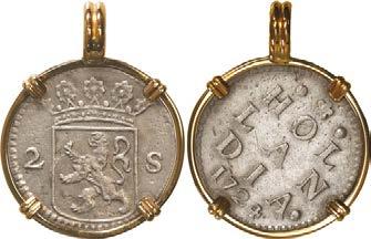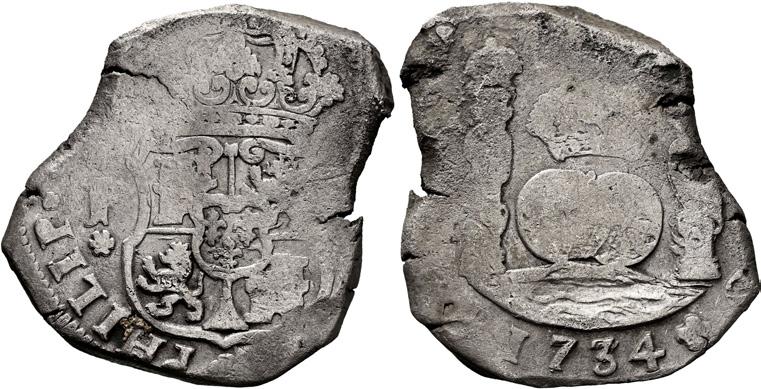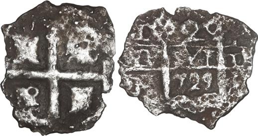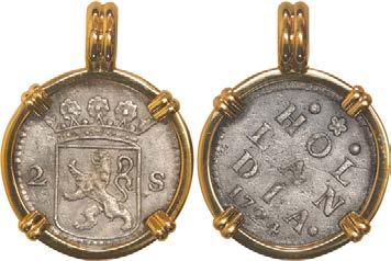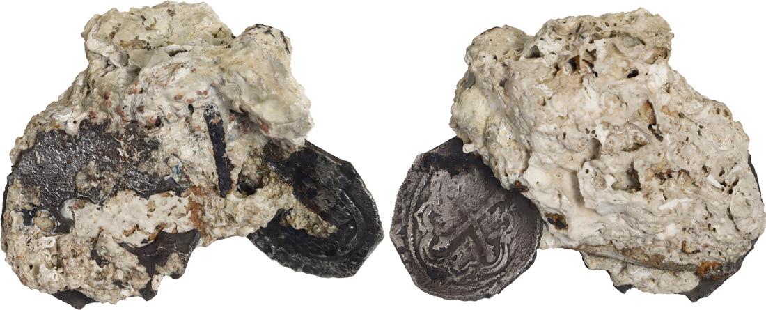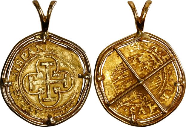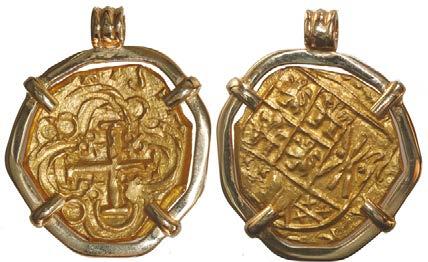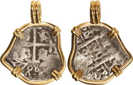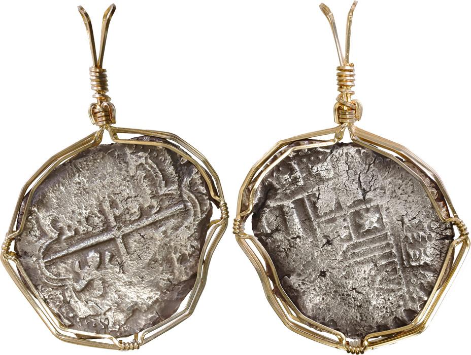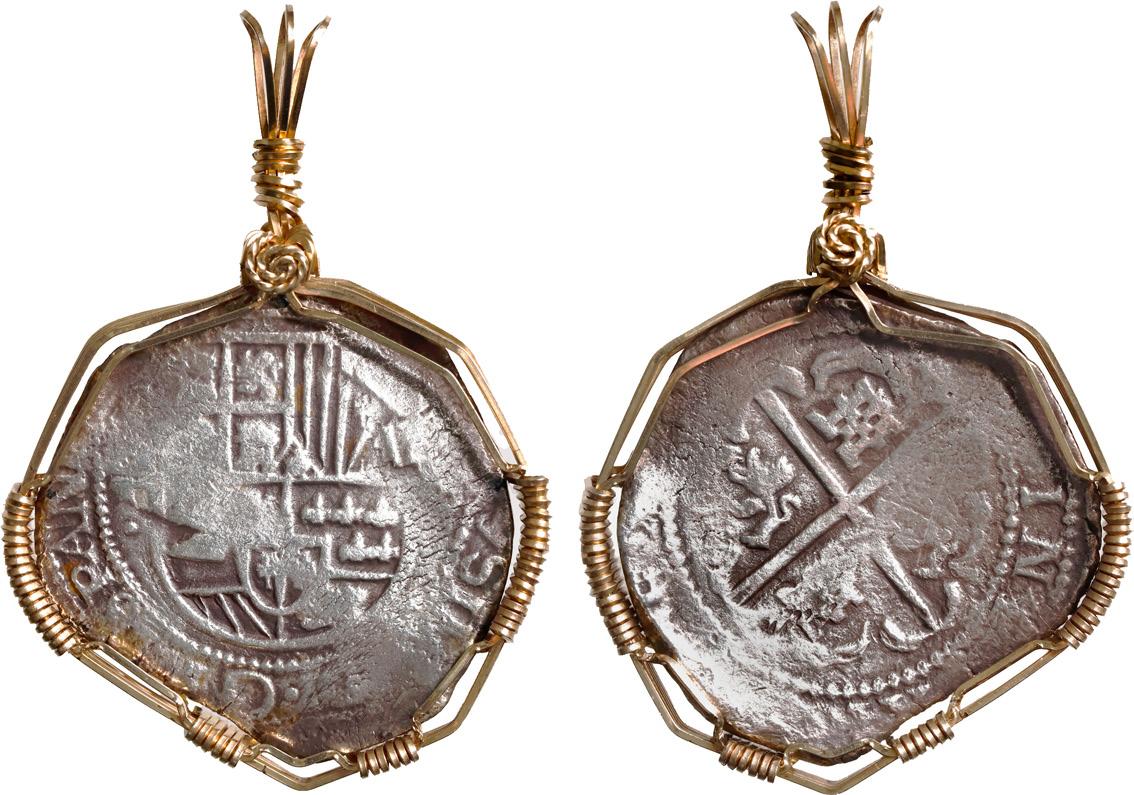 1933. MEXICO, Mexico City, cob 8 reales, Philip V, assayer not visible (J), style of 1705-12, ex-1715 Fleet, mounted cross-side out in 14K gold bezel with shackle bail and embellishments. 36.07 grams total. Very broad cob with bold partial cross and shield amidst flat peripheries, nice condition with minimal surface corrosion, set in a unique mount with dolphins and waves embellishments. From the 1715 Fleet, with photo-certificate. Estimate: $700-$1,000. 1934. MEXICO, Mexico City, cob 1 real, Philip V, assayer not visible, ex-1715 Fleet, mounted cross-side out in 14K gold wire pendant with shackle bail. 4.55 grams total. Corroded and a bit thin but with bold, nearly complete cross, shield side a bit obscured, neatly set in a decorated wire bezel. From the 1715 Fleet, with original Cobb Coin Co (Fisher) certificate 11858. Estimate: $200-$300.