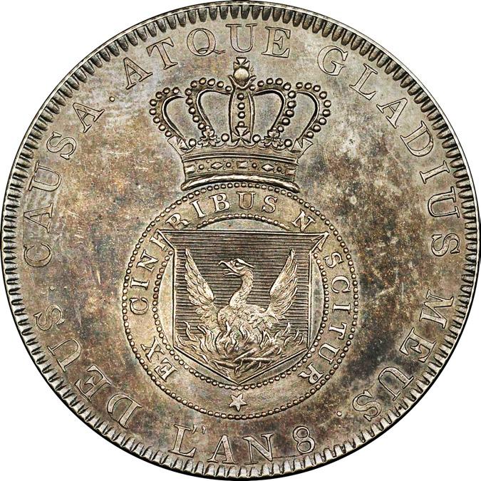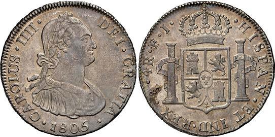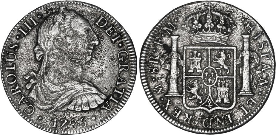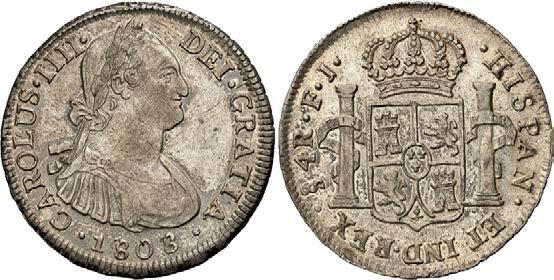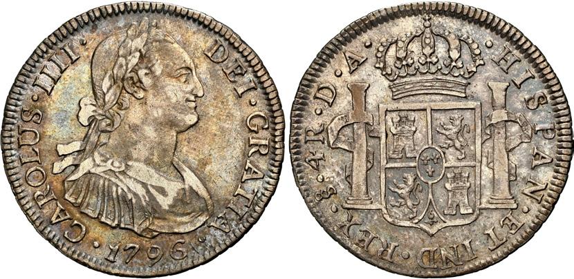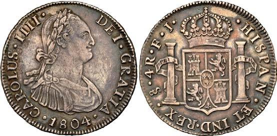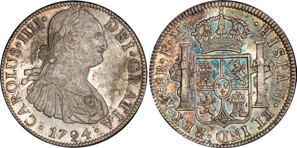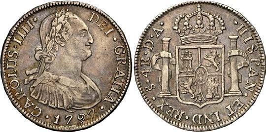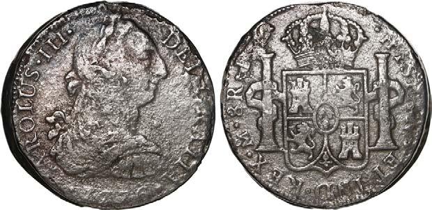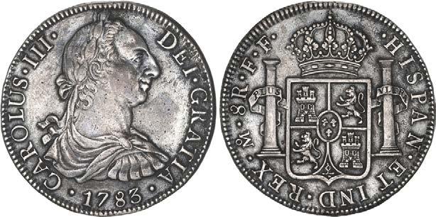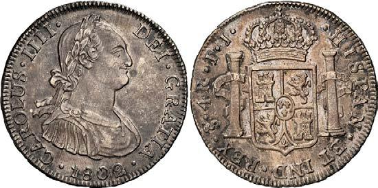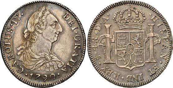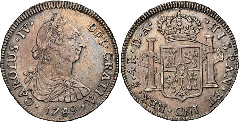 1896. MEXICO, Mexico City, bust 8 reales, Charles IV transitional (bust of Charles III, ordinal IV), 1789 FM. Yonaka-M8.89.III; Cal-950; KM-107. 26.81 grams. Bold XF with toned obverse and lustrous reverse, some staining and scratches along top edge. Estimate: $175-$250.