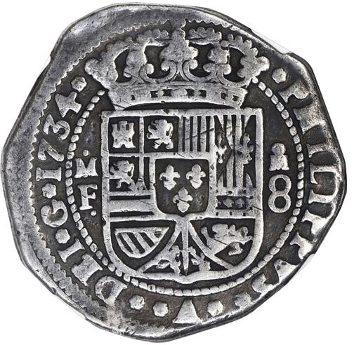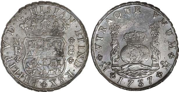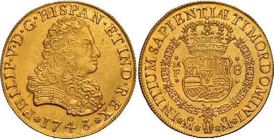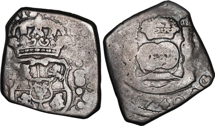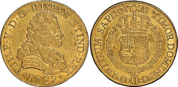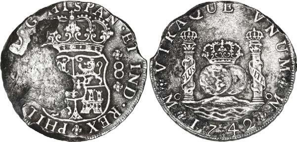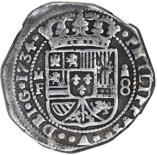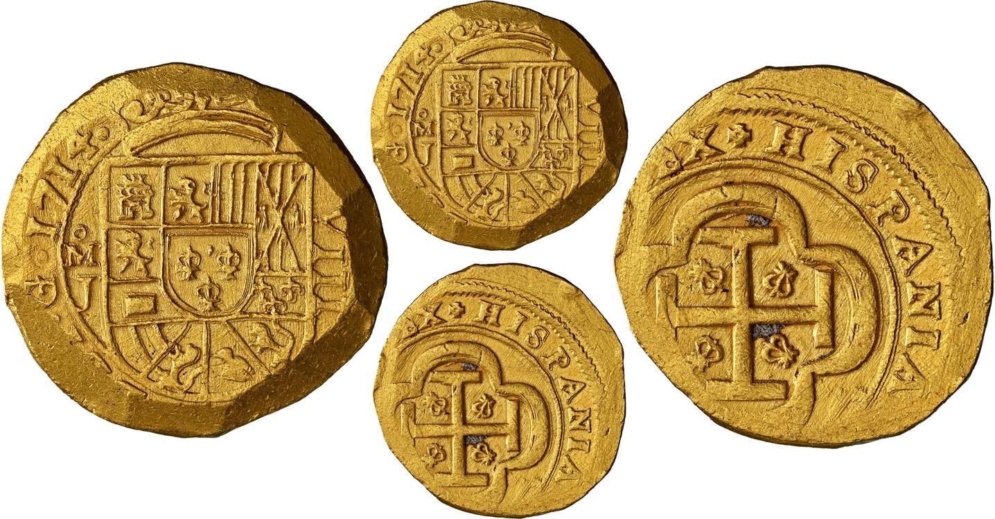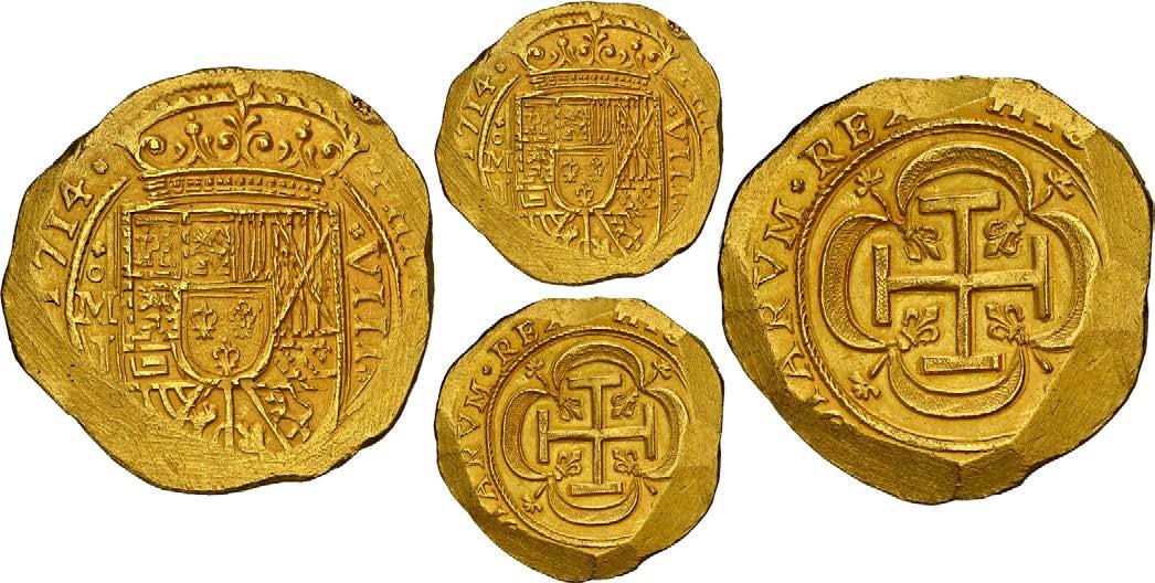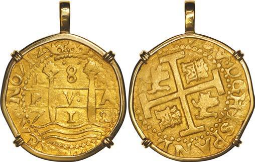 15. E C , exico City, gold cob 8 escudos, 1714 , C S 63 (1715 Fleet Shipwreck Label), Sedwick Plate. S-M30; Cal-2213; KM-57.2; Fr-6. 26.78 grams. Round flan with superb full shield despite graininess from progressive die-rust that eventually killed this die (see next lot), bold full date and oMJ and denomination VIII (but typically beveled periphery), full but off-center cross (harboring tiny patches of gray coral) with metal extending past the outer border of dots as a result, muted luster, rich yellow color. NGC #8228458-001. From the 1715 Fleet, Plate Coin on page 80 of the 2nd edition (1990) of The Practical Book of Cobs (stated on label). Estimate: $15,000-up.