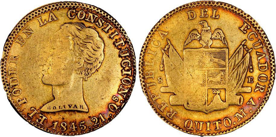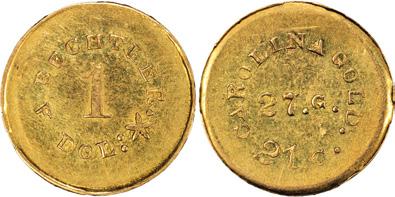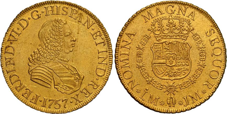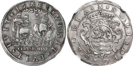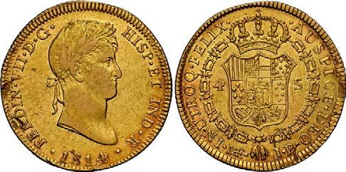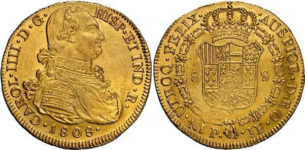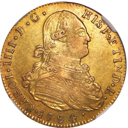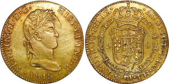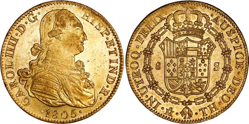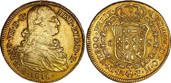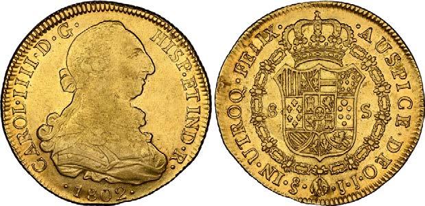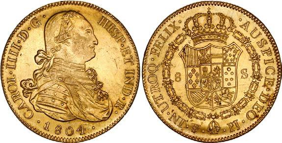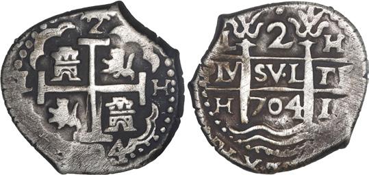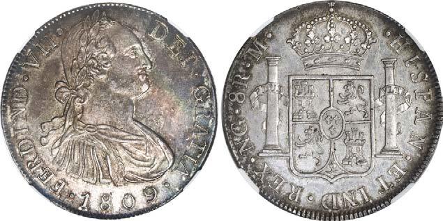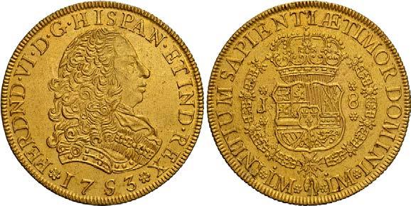 15. E C , exico City, gold cob 8 escudos, 1714 , C S 63 (1715 Fleet Shipwreck Label), Sedwick Plate. S-M30; Cal-2213; KM-57.2; Fr-6. 26.78 grams. Round flan with superb full shield despite graininess from progressive die-rust that eventually killed this die (see next lot), bold full date and oMJ and denomination VIII (but typically beveled periphery), full but off-center cross (harboring tiny patches of gray coral) with metal extending past the outer border of dots as a result, muted luster, rich yellow color. NGC #8228458-001. From the 1715 Fleet, Plate Coin on page 80 of the 2nd edition (1990) of The Practical Book of Cobs (stated on label). Estimate: $15,000-up.