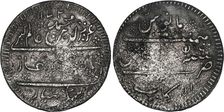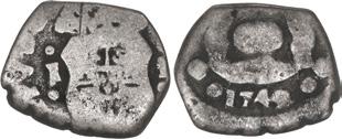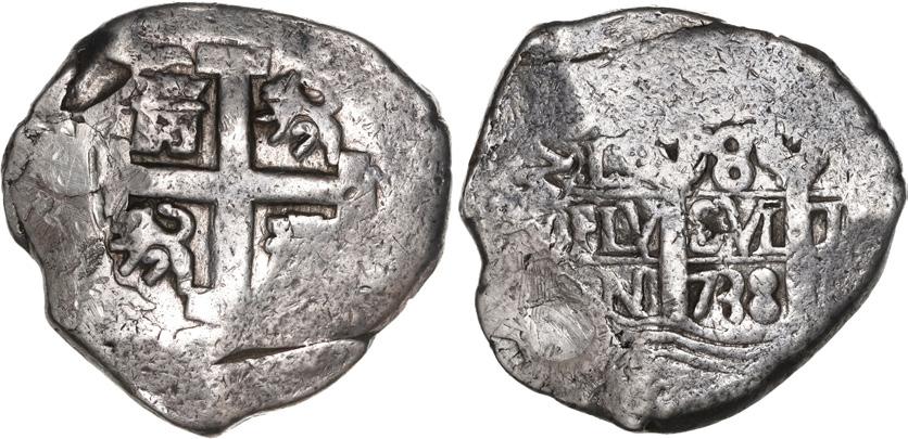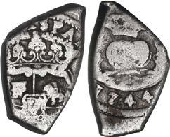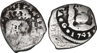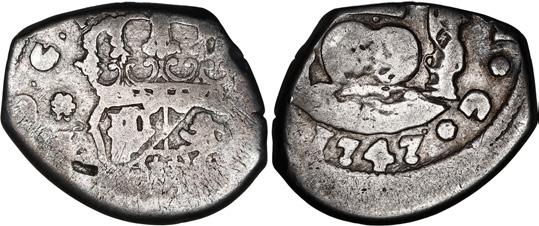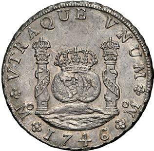 1893. MEXICO, Mexico City, pillar ½ real, Philip V, 1746 M. KM-66; Cal-273; Yonaka-M05.46a. 1.57 grams. Type with dot between date and assayer merged into the final digit of the former, plus re-punched 74 of date; cataloged by Yonaka in the same listing as those missing the dot entirely. Bold AU with deeply toned surfaces, some cleaning hairlines and horn silver spots. Estimate: $75-$110.