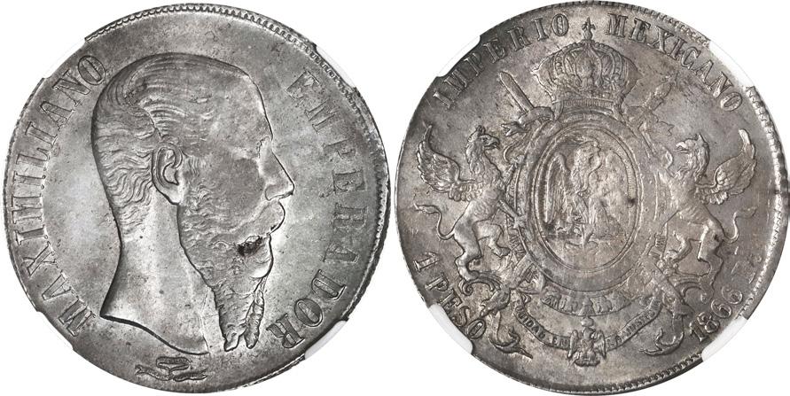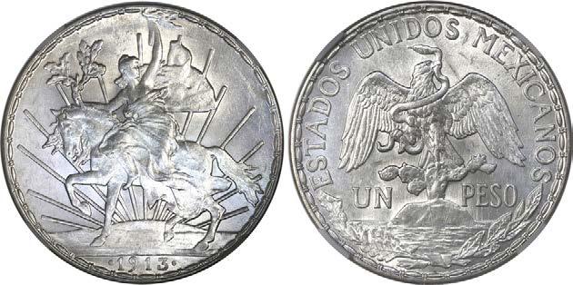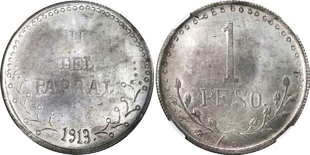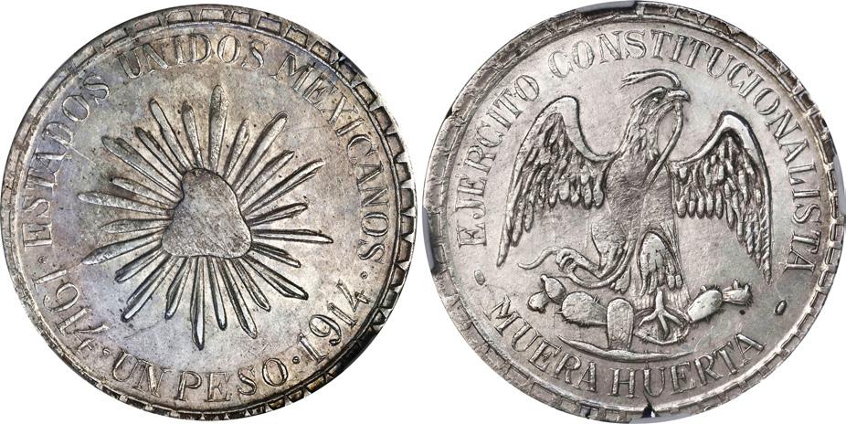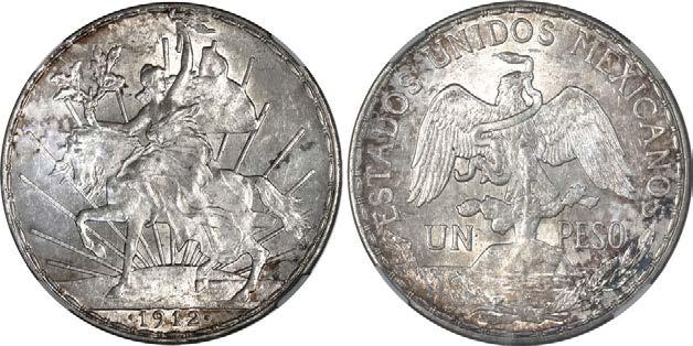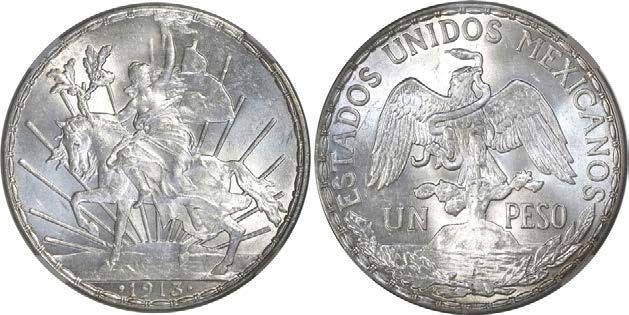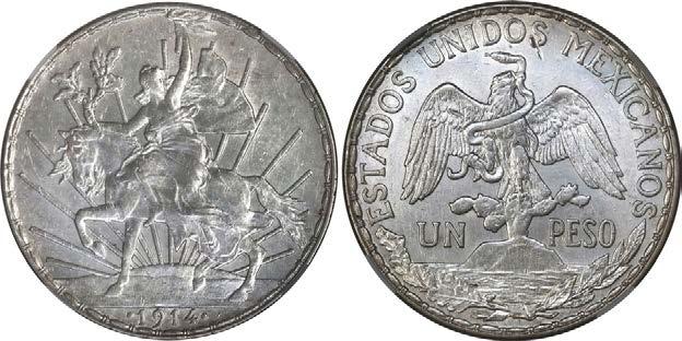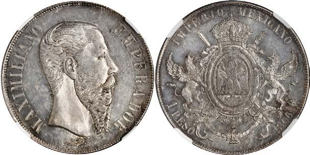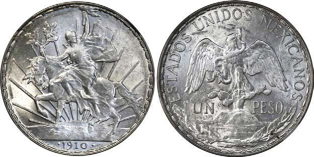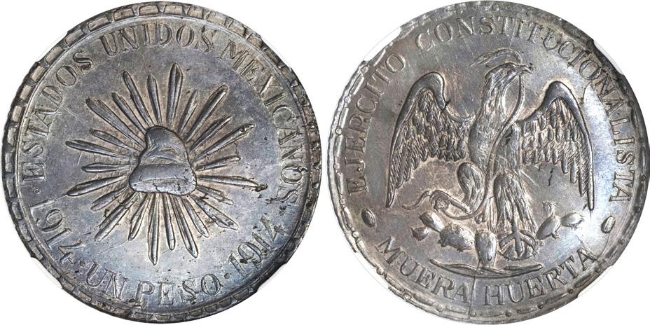 1904. MEXICO, Oaxaca, provisional 1 peso, 1915, fourth bust with unfinished truncation, C S 65. KM-740.1. Very lustrous and choice example of this scarce, one-year provisional type with well-struck details on both sides, lightly golden-toned surfaces. NGC #2896245-016. Estimate: $200-$300.