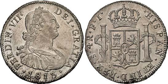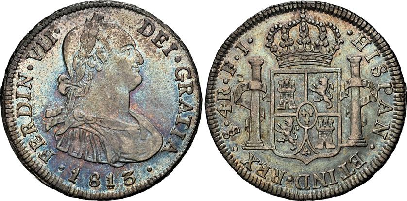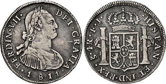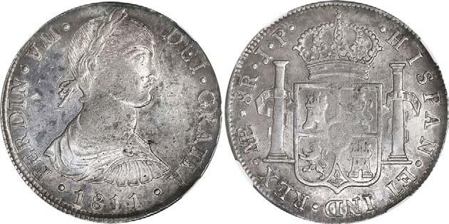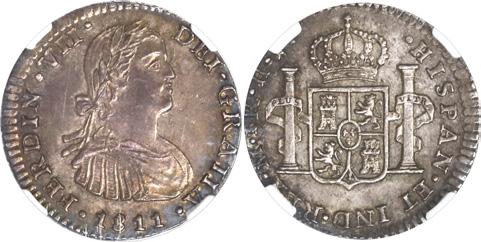 1913. PERU, Lima, bust 8 reales, Ferdinand VII transitional (“imaginary” bust), 1811 JP, short ribbons. KM-106.2; Cal-1242. 25.68 grams. VF with rainbow-toned fields, a couple of small marks on the bust, tougher final year of issue for this three-year type. Estimate: $150-$225.