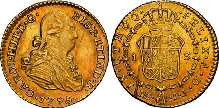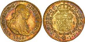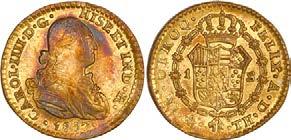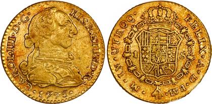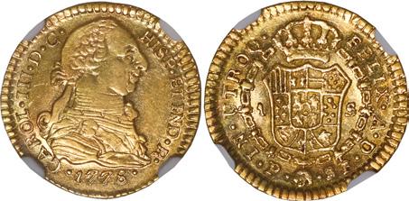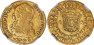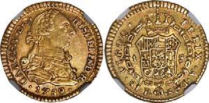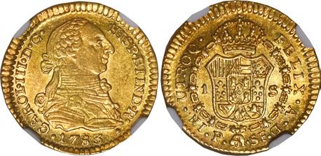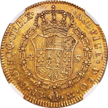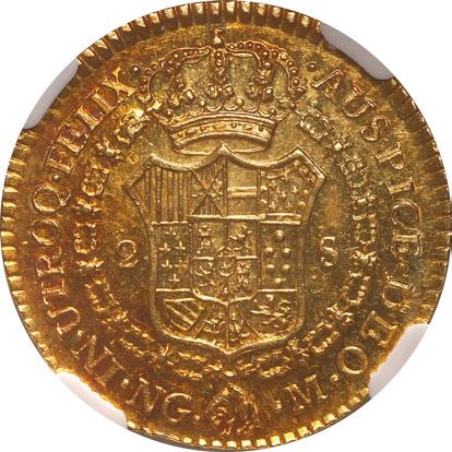 2. SPAIN, Seville, gold 1 escudo, Charles-Joanna, assayer Gothic D to right, mintmark S to left, NGC MS 62. Cal-198; Fr-153. 3.36 grams. Lightly red-toned with choice full shield and cross-and-tressure, clear mintmark and assayer, bold CAROLVS in legend, well centered. NGC #8415502-005. Estimate: $1,500-$2,250.