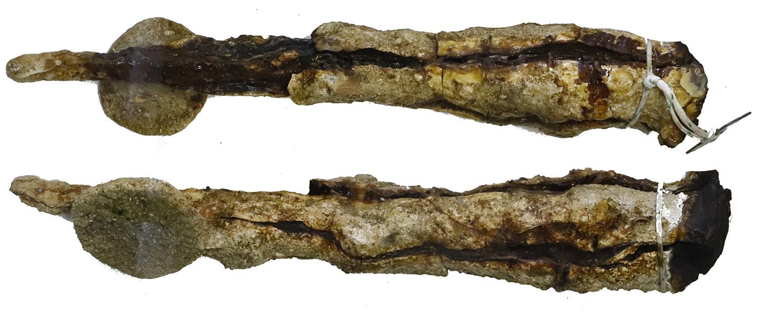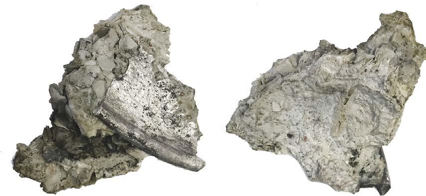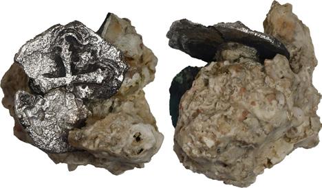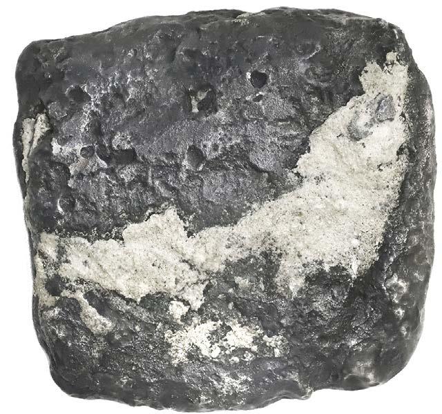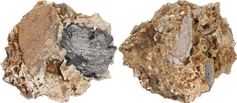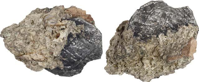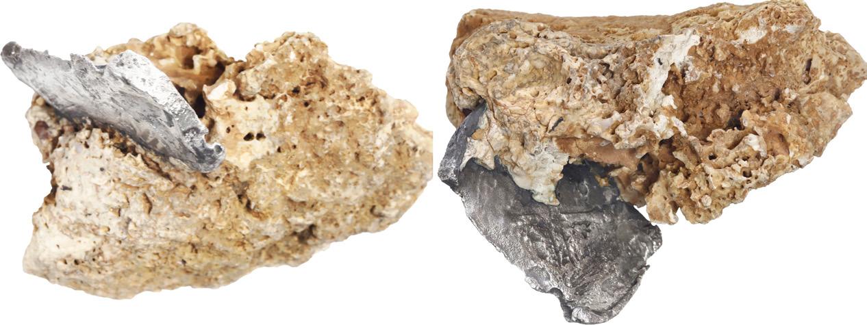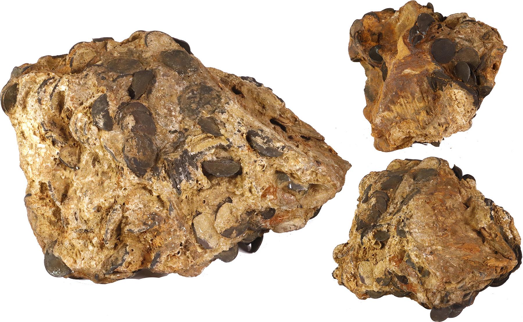 1943. Brass flintlock pistol butt-cap with encrustation, exGuadalupe-Tolosa (1724). 156 grams total. 4½” long. Unusual remnant of a long-gone pistol, the brown brass butt-cap intact with a small piece of encrustation adhered to the inside of the concave ball, a small hole at top where it would have been screwed onto the end of the gun. From the Guadalupe-Tolosa (1724), with original certificate from Captain Tracy Bowden through his contract with the Dominican Republic and copy of the article “Graveyard of the Quicksilver Galleons” by Mendel Peterson from the December 1979 issue of National Geographic Estimate: $100-$150. 1944. Lot of three clumps of lead musket balls and one musket flint, ex-Guadalupe-Tolosa (1724). 308 grams total. Roughly 1” to 2” each. A diverse group of ½”-diameter musket balls affixed to various pieces of rock and debris, one piece with a single ball protruding from its reddish matrix, another with two balls firmly embedded in their matrix, and a third with roughly four balls attached to a small piece of reddish matrix. Accompanying them is a light taupe, roughly rectangular musket flint. From the Guadalupe-Tolosa (1724), with original certificate from Captain Tracy Bowden through his contract with the Dominican Republic and copy of the article “Graveyard of the Quicksilver Galleons” by Mendel Peterson from the December 1979 issue of National Geographic. Estimate: $125-$200.