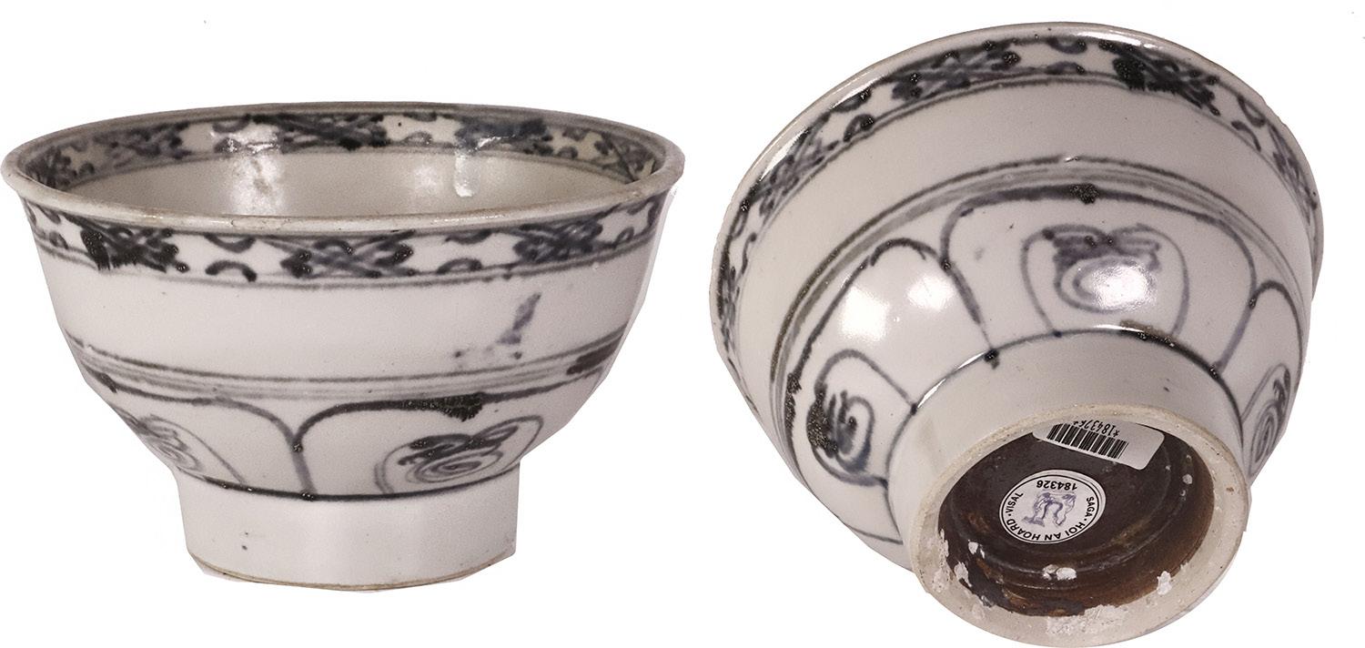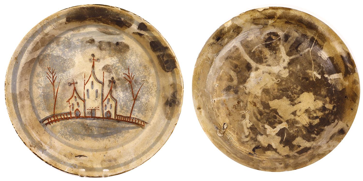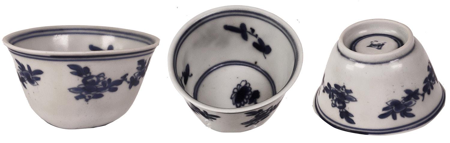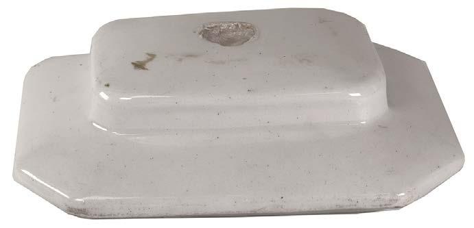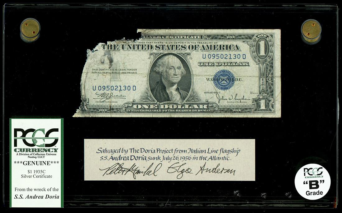 1948. Porcelain demitasse saucer, second class (cabin class), with logo of maker Richard Ginori on bottom, exAndrea Doria (1956). 94 grams. 4¾” in diameter. Small service piece with green maker’s marking of Richard Ginori on bottom in the center and faint remnants of embossed ITALIA Line crest on obverse just below the gilt-and-blue rim, entirely intact and an interesting artifact from one of the most recognizable shipwrecks in history. From the Andrea Doria (1956), with original certificate from the salvor (Gary Gentile) and hardbound book Saved (1979), by William Hoffer. Estimate: $125-$200.
