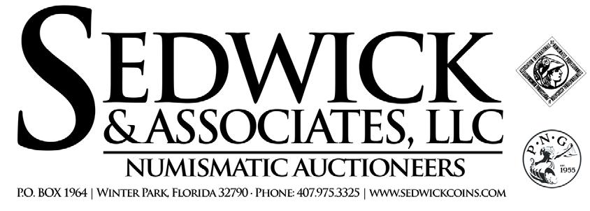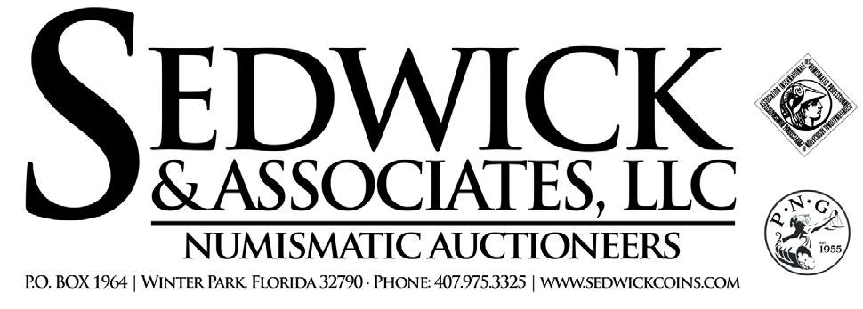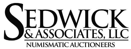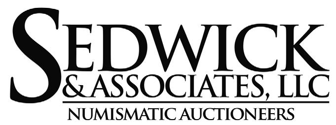 returned for any reason. Disputes as to authenticity shall be resolved by submission to PCGS or NGC, and if their determination is inconclusive, then the opinion of Sedwick & Associates, LLC shall stand. Any disputes, including proposed returns, must be brought to our attention no later than 2 days after receipt of the lot(s) by the Buyer and BEFORE return shipment to us, with any applicable refunds to be made immediately upon receipt of the returned item(s) by us. All returns must be received by us in unaltered condition and in their original, unopened, sealed ips no later than one month after the date of the rst auction session (note that late remittance, therefore, can negate return privileges). Any refunds for returns paid for by credit card will be subject to a 2% return fee; those paid by PayPal will incur a 4% return fee. In the event of loss or damage, Sedwick & Associates, LLC’s liability shall be limited to the hammer price plus buyer’s fee only. NGC or PCGS census data (“ nest known,” etc.) are given based on the date of cataloging and are not presumed to be accurate forever. Note that any group-lots returned due to error in listing must be returned in entirety. Where not already included in the lot description, we will provide our own certi cate of authenticity upon request by the buyer for a fee.