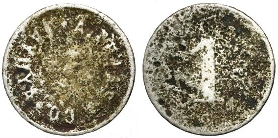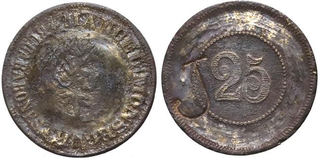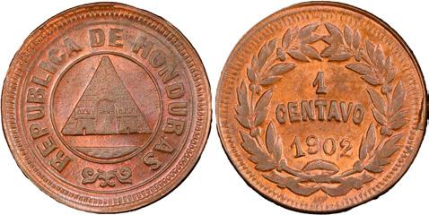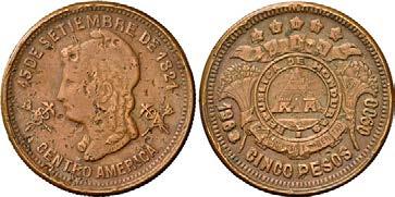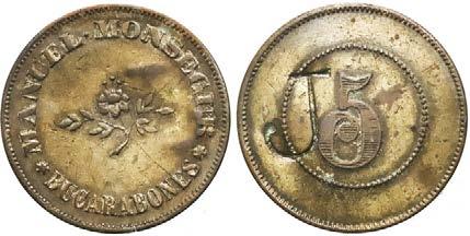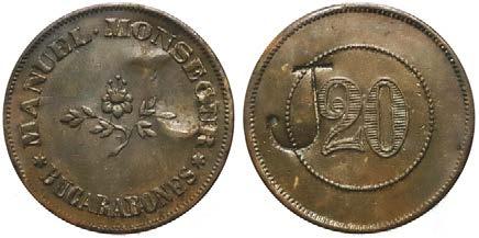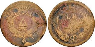 1903. MEXICO, Michoacán, Tanteo del Pilon, copper 1/8 real token, 1861. Grove-713. 4.64 grams. XF with interesting doubled striking resulting in a “18661” date on one side and double mountain and sun on the other, chocolate brown-toned surfaces, a few contact marks on the date side. Estimate: $100-$150.