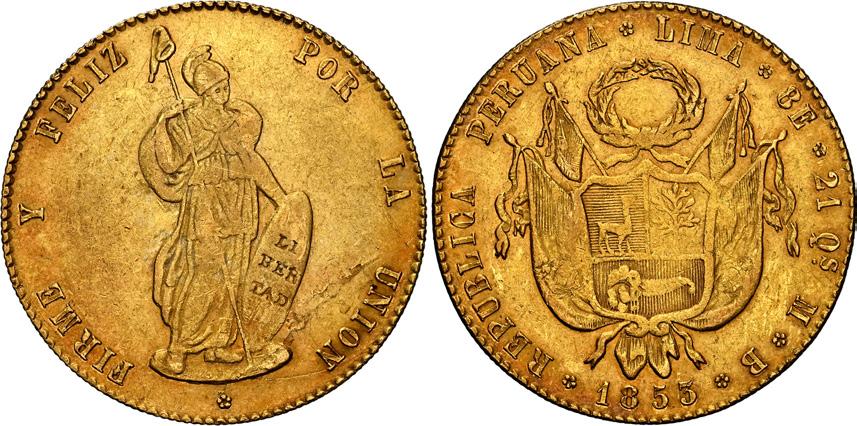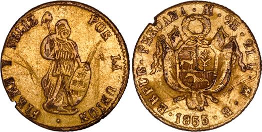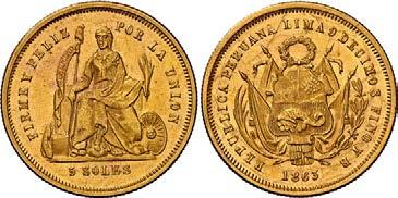 1915. PERU, Lima, gold 5 soles, 1863 YB, NGC UNC details / cleaned, ex-Almenara. KM-192; Fr-72. 8.06 grams. Boldly struck example of this one-year type, some surface hairlines in the fields (0.2334 AGW). NGC #8405048-012. Pedigreed to the Almenara Collection (stated on label). Estimate: $800-$1,200.