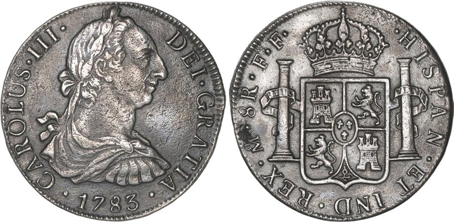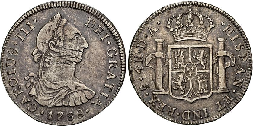 1888. MEXICO, Mexico City, pillar 8 reales, Charles III, 1768 MF. Yonaka-M8.68; Cal-1094; KM-105. 26.72 grams. Polished AXF with a few scratches around the right pillar. Estimate: $250-$375.