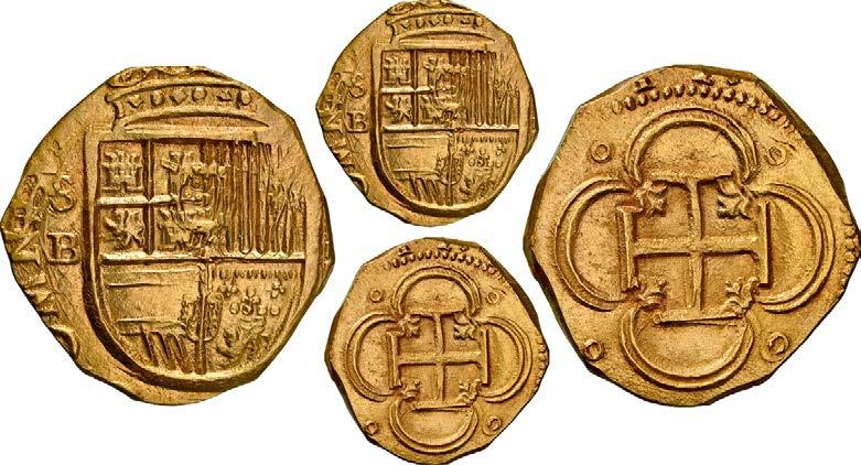 7. SPAIN, Seville, gold cob 4 escudos, Philip III, assayer B, in legend, C S 6 , finest known in NGC census. Cal-1097; Fr-185. 13.48 grams. Exceptionally bold full cross-and-tressure and shield with full S-B to left inside clear OMNIVM, lustrous with hint of light red toning, the finest on record and deservedly so. NGC #8416145-001. Estimate: $5,000-$7,500.