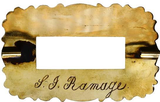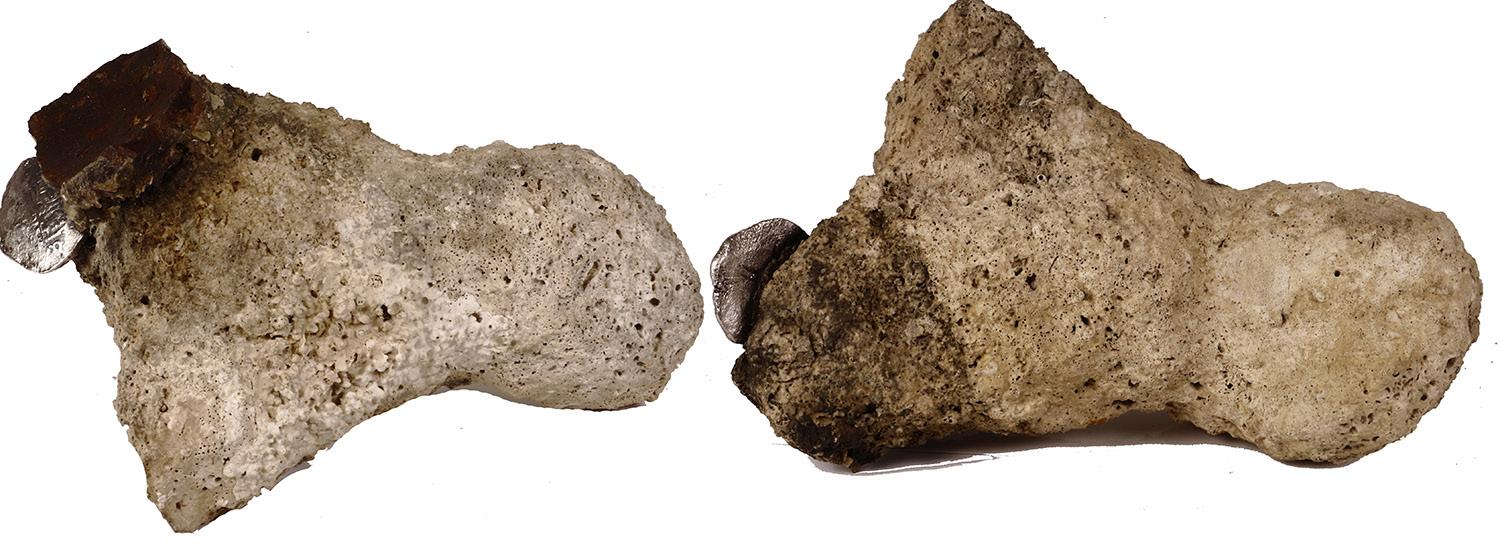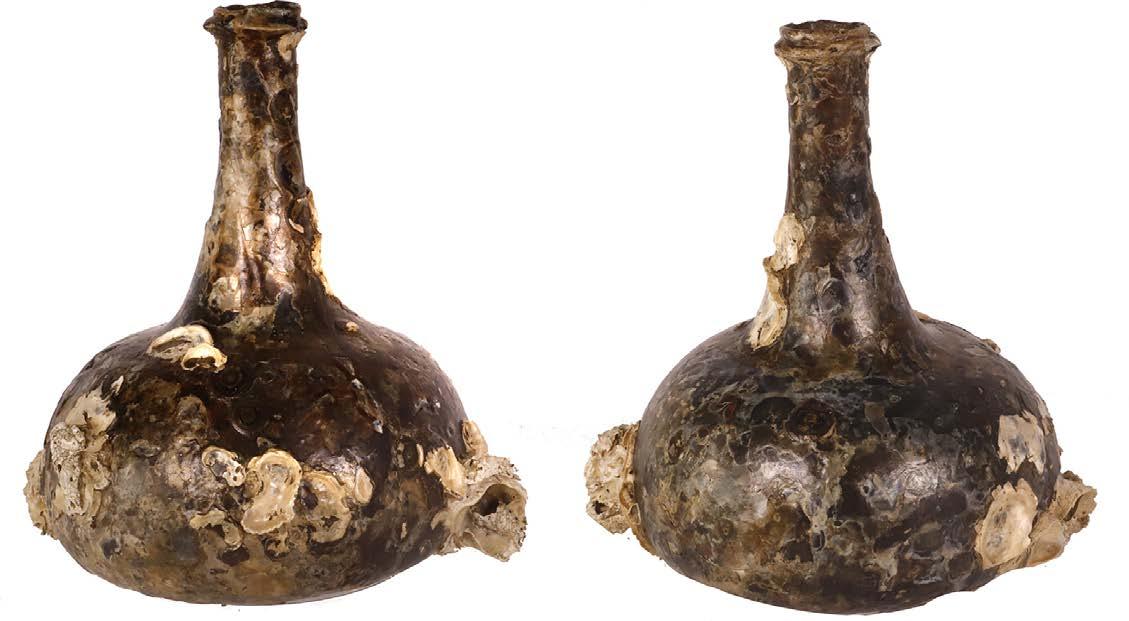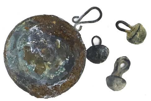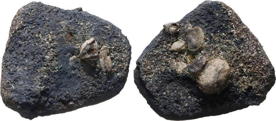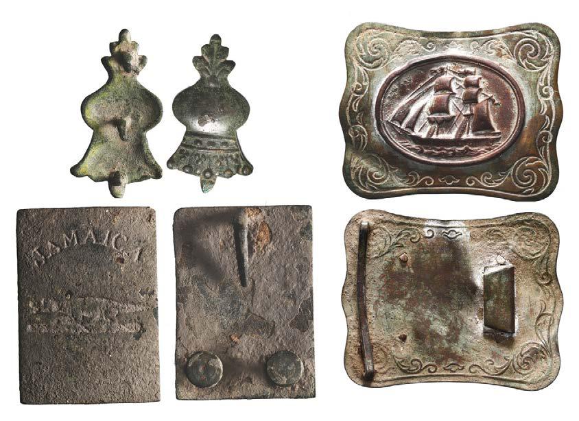 1946. Lot of fi e small artifacts (brass scabbard frog, three lead musket balls, and one musket flint), ex-Colossus (1798). 116 grams total. From later finds made in the stern section of the wreck by Todd Stevens in 1999, these small pieces include a well-preserved 2¼” scabbard frog for attaching a sword to a belt, three dark and dusty ½” lead musket balls, and one 1¼” x 1¼” copper-colored wedge-shaped musket flint. From the Colossus (1798), with original personal letter from the salvor (Todd Stevens). Estimate: $100-$150.