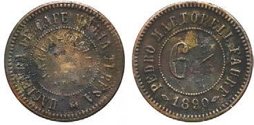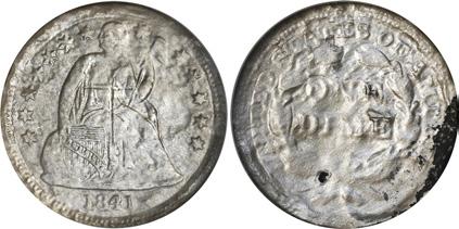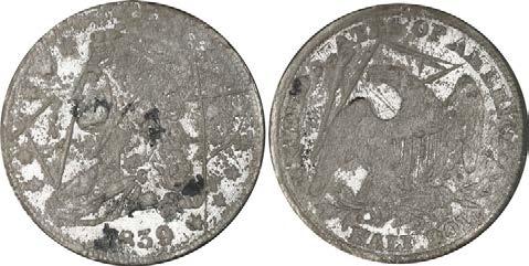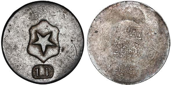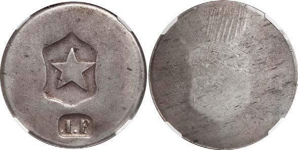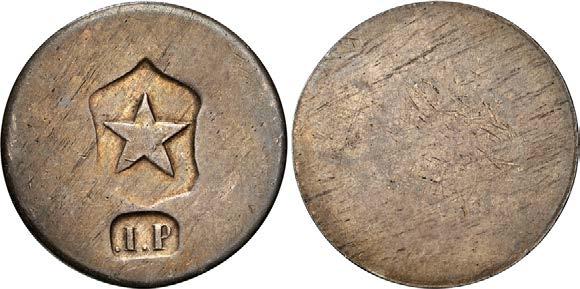 1930. UNITED STATES, Philadelphia mint, copper-nickel Flying Eagle cent, 1858, large letters variety, with private crowned-GP? countermark, NGC Poor details / private countermark. Interesting piece with a private crowned G.P. (final letter not certain) countermark on the obverse of a heavily circulated Flying Eagle cent, reminiscent of the Azores GP 15 reis countermark of 1887. NGC #2122876-050. Estimate: $100-$150.