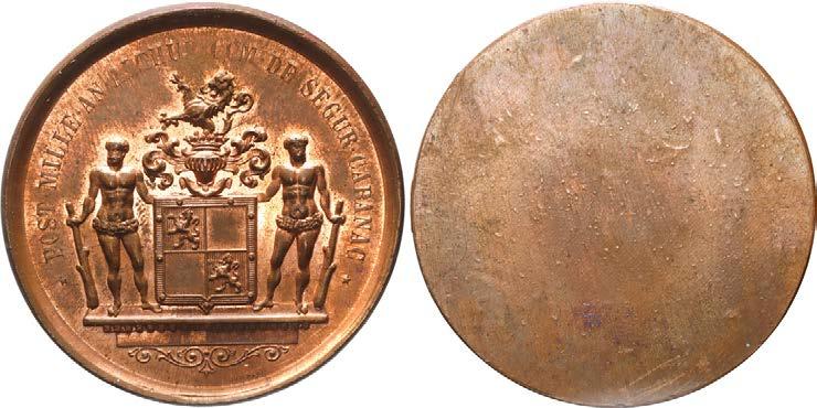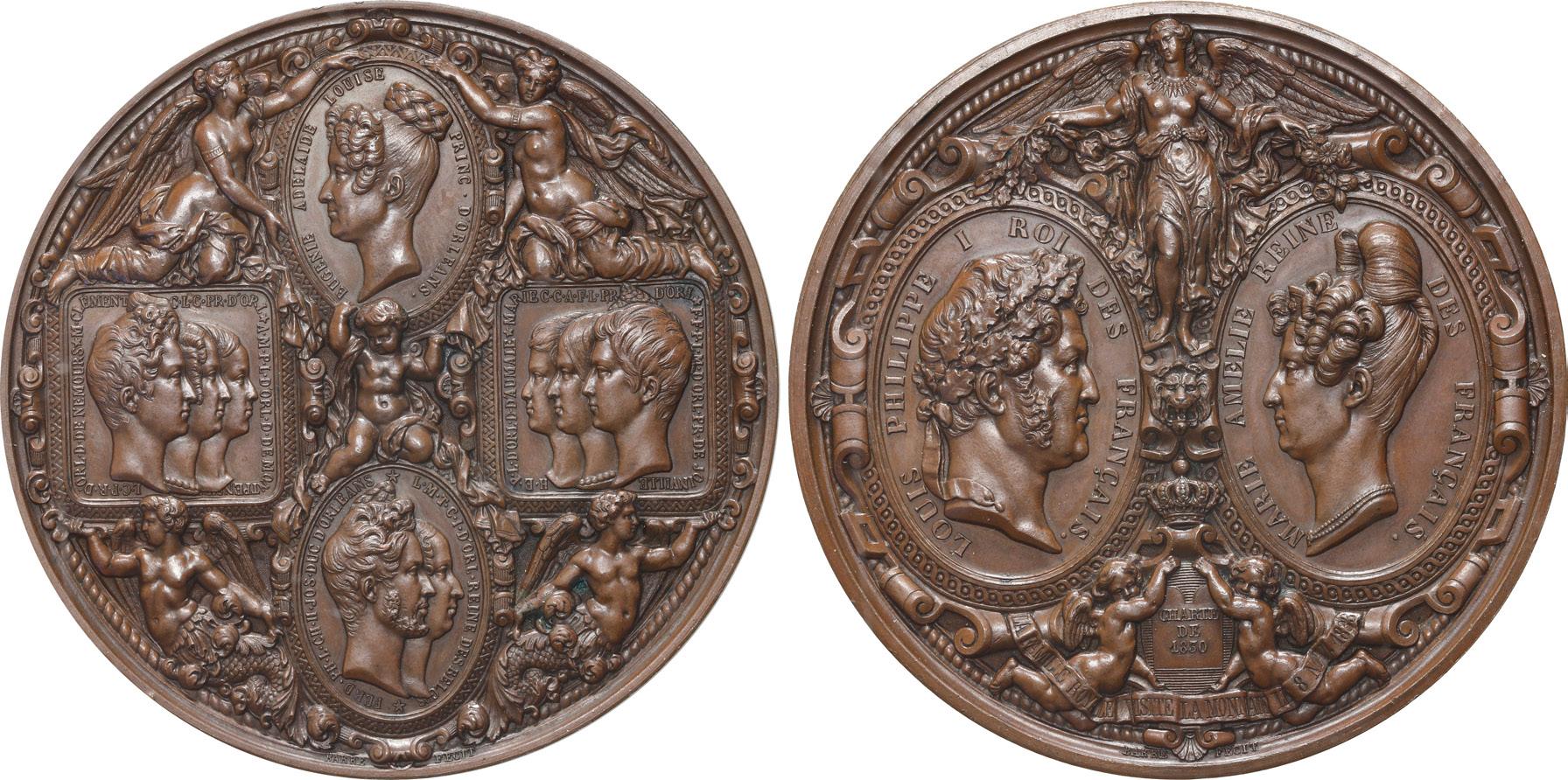1924. FRANCE, lot of two bronzed-tin uniface clichés, no date (ca. 1810), Napoleon and Marie Louise, by Andrieu. 97.97 grams total. 69 and 67 mm. Uniface pair with laureate bust of Napoleon facing right with NAPOLEON / EMPEREUR flanking and bust of Marie Louise with MARIE LOUISE / IMPERATRICE. flanking. Clichés like these were intended for the engraver to sell on his own account, not part of the government order for medals. Both AU+ with very minor cabinet rub on the high points. Pedigreed to the BS auction of January 2010, with original lot-tag 823. Estimate: $125-$200. 1925. FRANCE, bronze medal restrike, dated 1821, Death of Napoleon on St. Helena, by Andrieu. Bramsen-1844 for original issue. 137.29 grams. 68 mm. Obverse: Laureate bust of Napoleon facing right, with a crown of oak and laurel wrapped in a ribbon, ribbon bears the names of his famous battle victories, anepigraphic; Reverse: View of the island of St. Helena, ship departing at right, eagle flying above, and sun setting at right; perimeter legend - IL MOURUT SUR UN ROCHER (He Died on a Rock), and exergue legend - `ILE STE. HELENE. 5 MAI 1821; Edge: Cornucopia and BRONZE. Mint State, high-relief piece with glossy brown surfaces bearing some purple and red hues. Estimate: $100-$150.