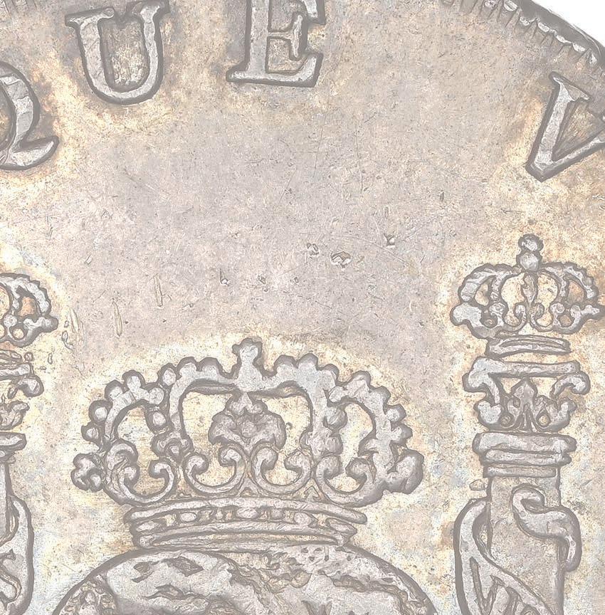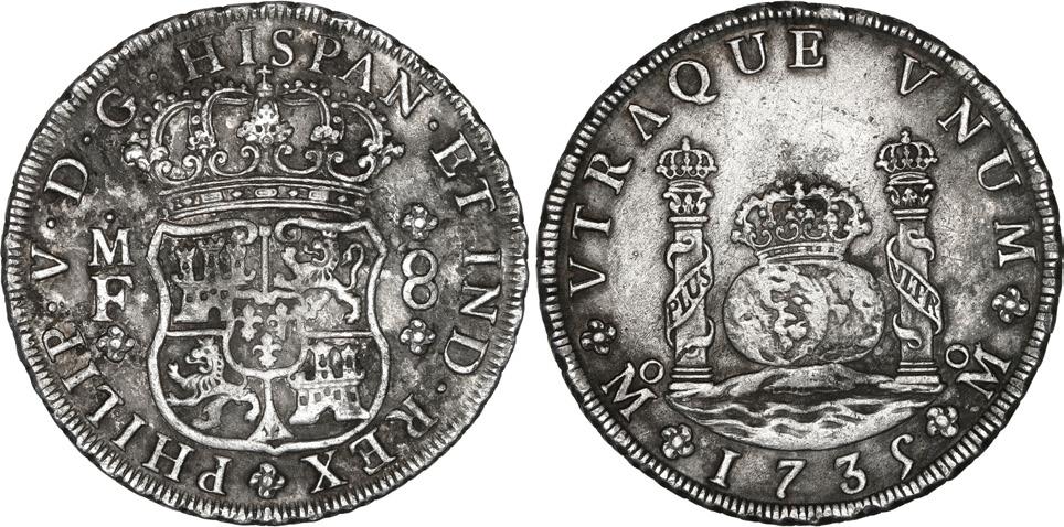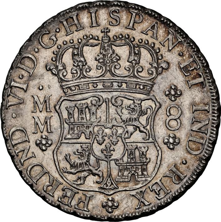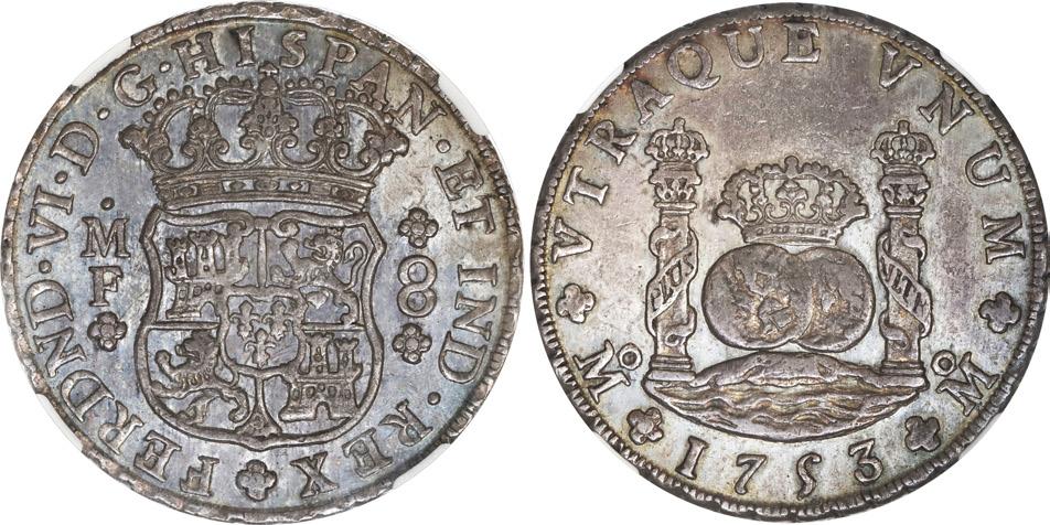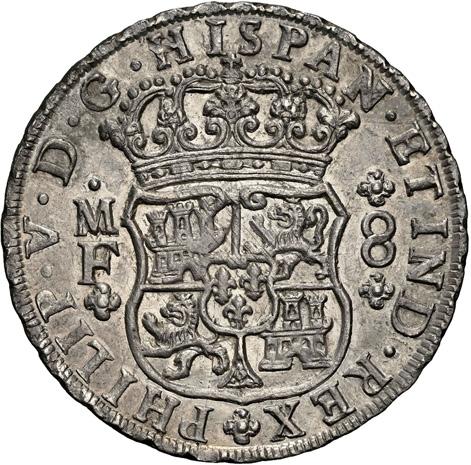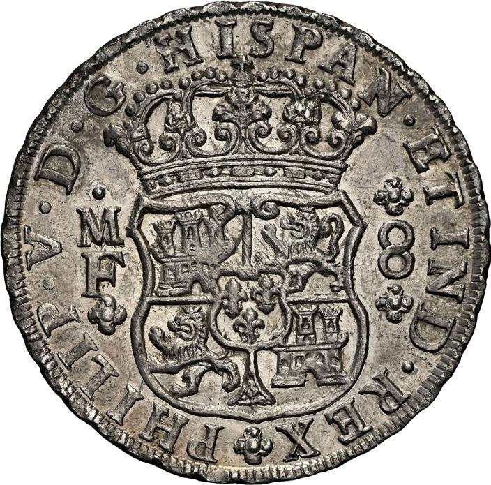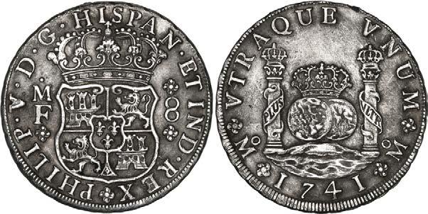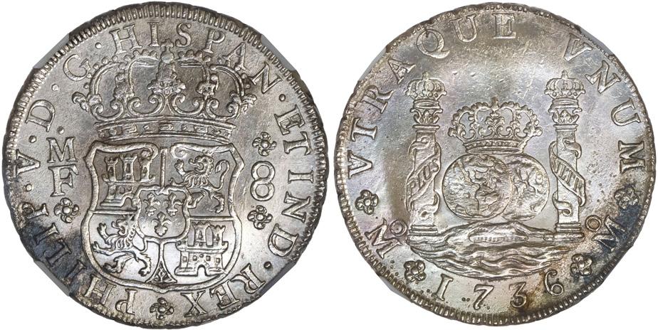 1887. MEXICO, Mexico City, pillar 8 reales, Philip V, 1746 MF. Yonaka-M8.46; Cal-1472; KM-103. 26.80 grams. AU with tiny chopmark inside the denomination 8, fairly lustrous with patch of very dark rainbow toning along the rim. Estimate: $200-$300.