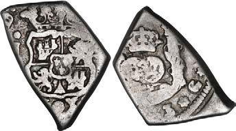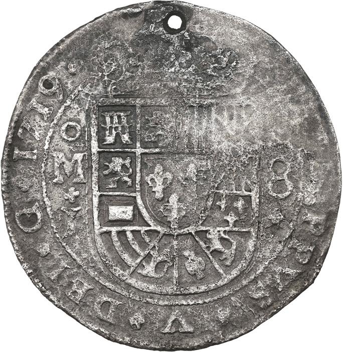 11. E C , exico City, gold cob 8 escudos, 1708 , ery rare, C A details remo ed from ewelry (1715 Fleet Shipwreck Label). S-M30; Cal-2204; KM-57.1; Fr-6. 26.89 grams. Clear bottom of 08 of date (one of only three examples we can confirm) outside of bold full oXMJ to left of nearly full shield, most of cross (“box-end” style), typically beveled peripheries with blunted edge-points (as made) that we suspect NGC mistook for mounting damage, light yellow color, some stray marks. NGC #8473406-001. From the 1715 Fleet. Estimate: $10,000-$15,000.