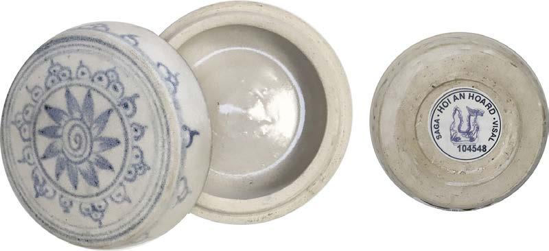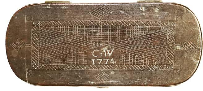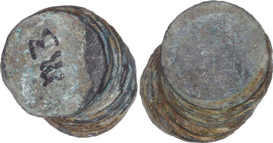1945. Small brass ring, button, and two tacks in a souvenir “treasure chest,” ex-1733 Fleet. 82 grams total. Box is 3½” x 2¼” x 2¼”. Four small artifacts nestled in an attractive wood chest, each piece made of brass, none more than about ¾” in diameter or ½” long. From the 1733 Fleet (San Jos site), with original certificate from the salvor, Ron Molinari, and copy 229 1000 of his book Following the Lure of the Galleon Treasures (2009), signed by the authors (Ron and Theresa Molinari). Estimate: $100-$150.