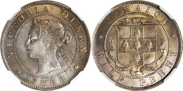 1868. JAMAICA, copper-nickel farthing, Victoria I, 1888, NGC MS 65, ex-Rudman. KM-15. Beautifully rainbow-toned piece with substantial luster. NGC #2792045-013. Pedigreed to the Isaac Rudman Collection. Estimate: $100-$150.
