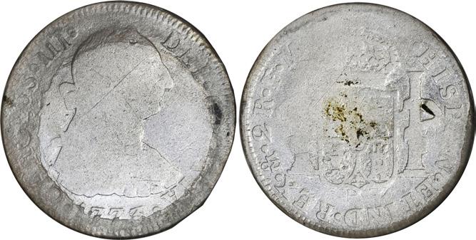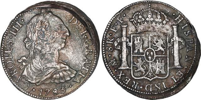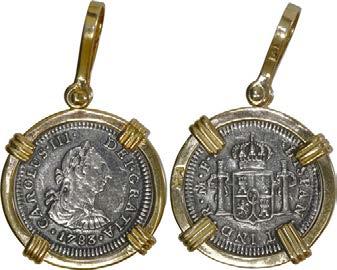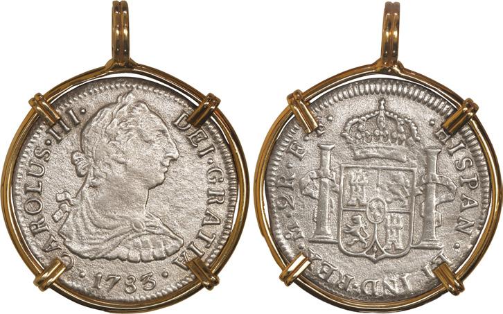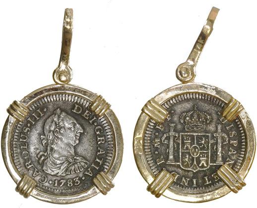 1935. MEXICO, Mexico City, bust 2 reales, Charles III, 1783 FF, ex-Cazador (1784), mounted in silver pendant with fixed bail. Yonaka-M2.83; KM-88.2; Cal-676. 7.95 grams total. XF with silvery, mildly corroded surfaces yet fully detailed and securely set in its mounting. From the Cazador (1784), with original (generic) certificate from the salvor and photo-certificate. Estimate: $200-$300.