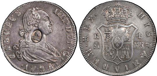 1898. MEXICO, Mexico City, bust 4 reales, Charles III, 1789/8 FM, rare. Yonaka-M4.89.IIIa; Cal-unl; KM-unl (97.2a for type). 13.41 grams. Somewhat lustrous AXF piece with clear and rare overdate, a few contact marks in the fields. Estimate: $175-$250.