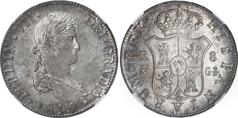 1897. MEXICO, Mexico City, bust 8 reales, Ferdinand VII, 1820 JJ. Yonaka-M8-120; Cal-1336; KM-111. 26.89 grams. AXF with polished surfaces. Estimate: $70-$100.