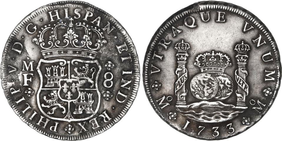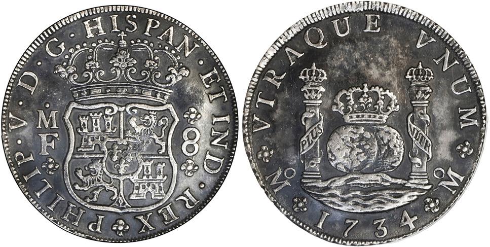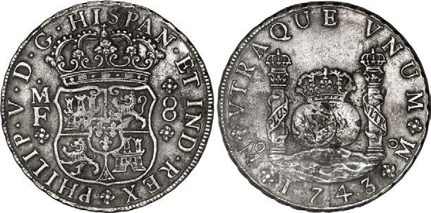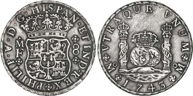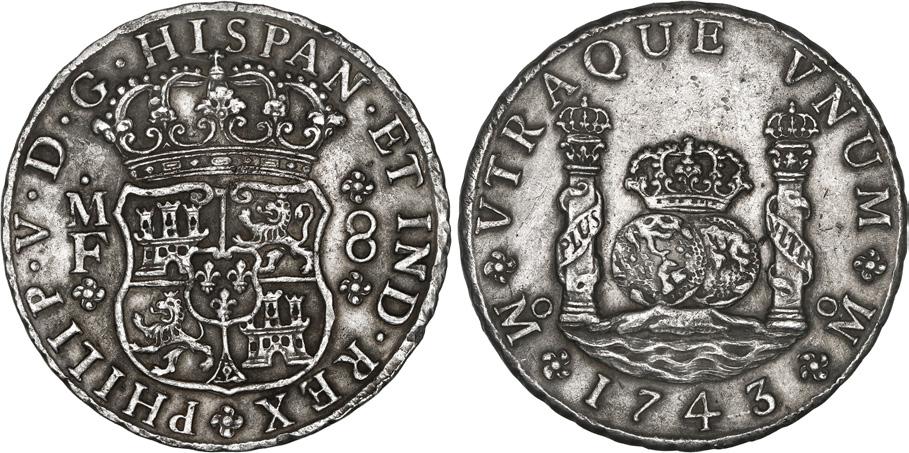 1885. MEXICO, Mexico City, pillar 8 reales, Philip V, 1743 MF, ANACS AU 50 details / corroded, cleaned. Yonaka-M8.43; KM-103; Cal-1463. Bold design elements stand out against dark gray-toned fields exhibiting minor surface corrosion and dark encrustation spots. ANACS #7718906. Estimate: $300-$450.