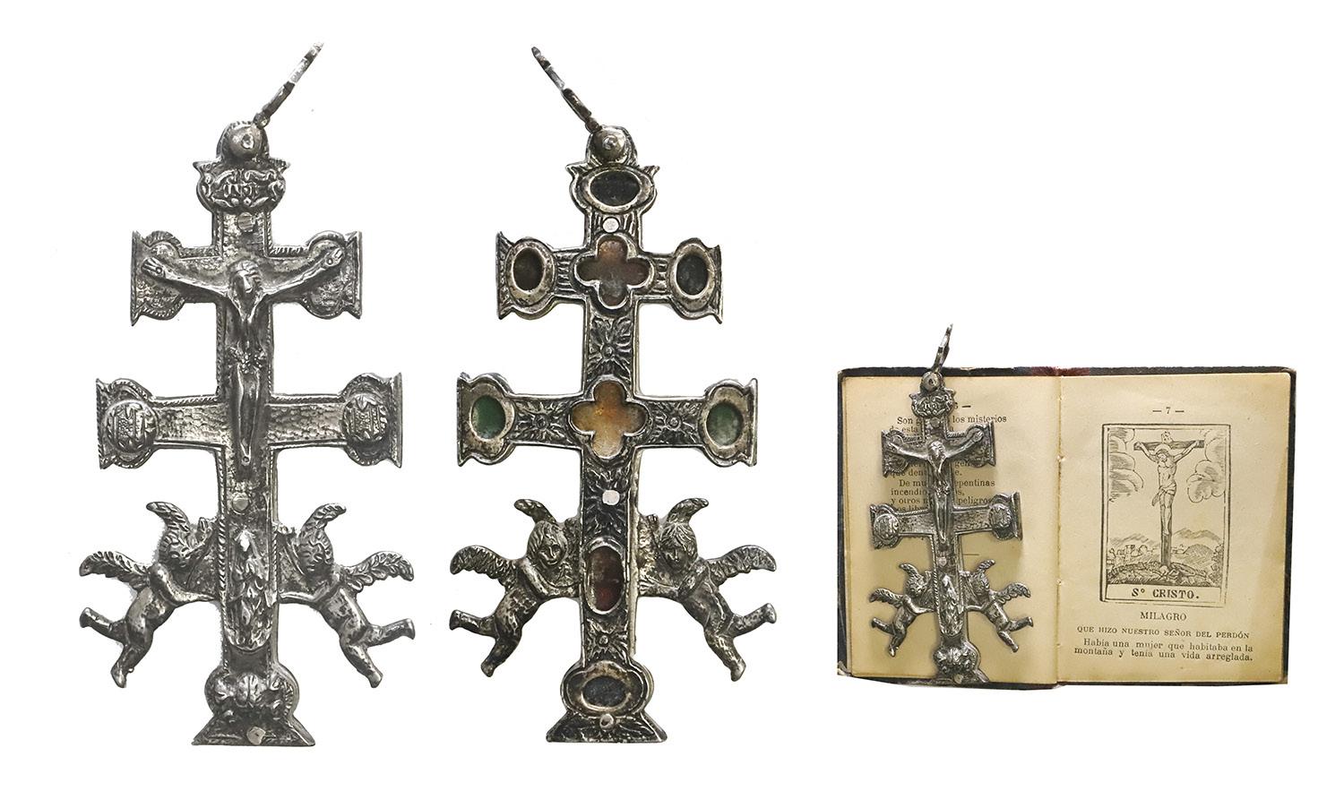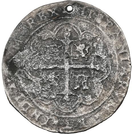 1939. BOLIVIA, Potosí, cob ½ real, Charles II, date not isible, mounted cross-side out in 14K gold bezel with fixed bail. 2.86 grams total. Bold (if a little crude) cross, partial monogram and shield on this dark gray-toned, lightly corroded piece, securely set in a custom bezel. Estimate: $250-$375.
