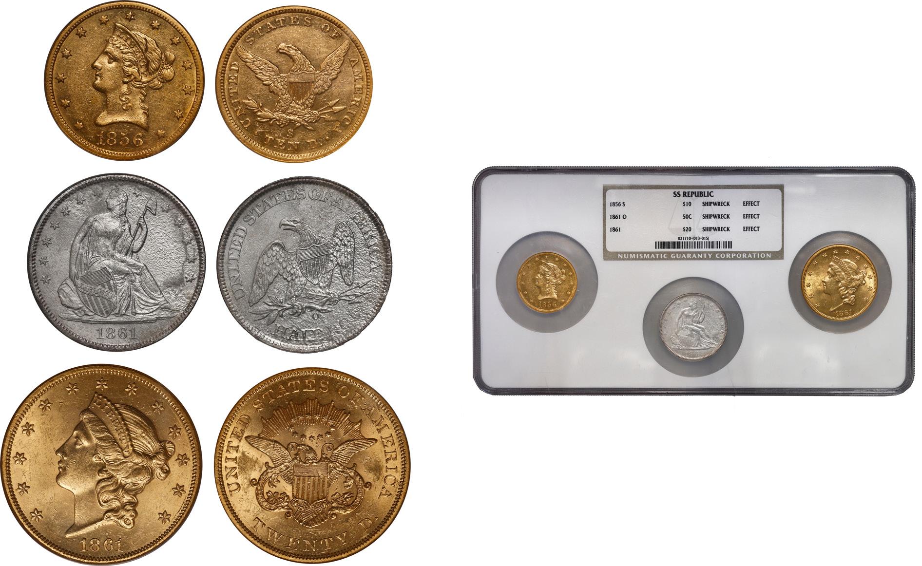 Of course, our treasure coverage is certainly not limited to Spanish colonial cobs. In fact, in this sale we feature all of the famous United States shipwrecks, namely S.B. Pulaski (1838), S.S. New York (1846), S.S. Central America (1857), S.S. Brother Jonathan (1865), and S.S. Republic (1865).