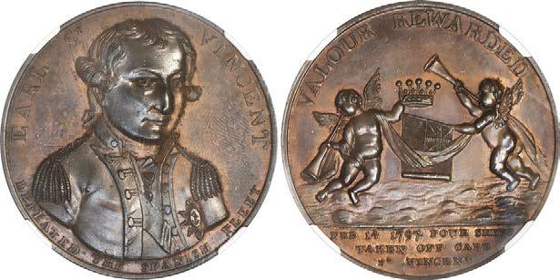 1927. GREAT BRITAIN, white metal medal, 1797, Admiral John Jervis / Battle of Cape St. Vincent, by G. Mills and . .A. Brenet, C S 6 , finest and only example in NGC census, ex-Rudman. BHM-438; Eimer-882. 40 mm. Obverse with left-facing bust of Admiral John Jervis inside legend ADMIRAL EARL / ST VINCENT G.C.B.; reverse with winged Victory hovering above two Spanish ships at which she hurls thunderbolts above three-line exergue with SPANISH FLEET DEFEATED. / OFF CAPE ST. VINCENT / XIV. FEBY. MDCCLXXXXVII flanked with makers’ names. Popular medal design depicting the defeat of the Spanish fleet by an allegorical thunderbolt-wielding Victory, number 4 in James Mudie’s 1820 series of British Victories. Frosted and toned design stands in contrast with the flashy, prooflike fields. NGC #6097540-016. Pedigreed to the Isaac Rudman Collection (stated on label). Estimate: $100-$150.