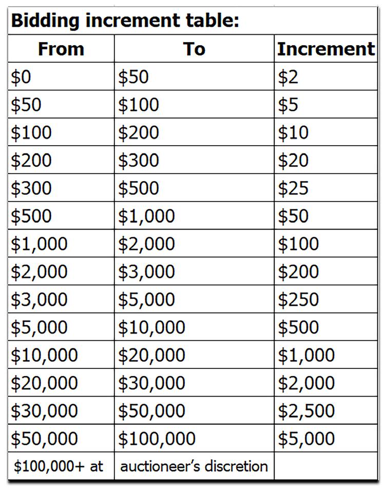 2. Winning bids will be reduced automatically by the iCollector platform to the next increment above the second-highest bid. In the case of tie bids, the earliest bidder will win the lot. Bidders are advised to provide allowable percentage increases to avoid losing lots due to a tie.