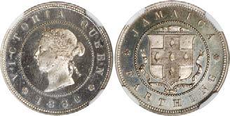1870. JAMAICA, copper-nickel farthing, Victoria I, 1900, NGC MS 63, “top pop,” ex-Rudman. KM-15. Tied with two others for finest known in the NGC census. Quite lustrous with light golden toning, final year of issue for this type. NGC #3392780-025. Pedigreed to the Isaac Rudman Collection (stated on label). Estimate: $100-$150.