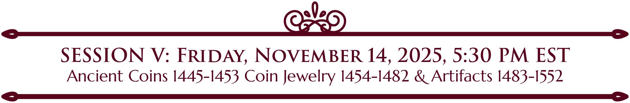 16. All bidders and consignors acknowledge and agree that the Auctioneer (Sedwick & Associates, LLC) does NOT guarantee that auctions will be unimpaired, uninterrupted or error-free and accordingly shall not be liable for such eventualities. Any errors in the printed catalog will be recti ed on the website and iCollector as they come to our attention, and those corrected listings shall be deemed the binding descriptions at the time of the auction. e Auctioneer, in its sole and absolute discretion, may accept or decline any bid, remove bids and reopen bidding, withdraw lots, or change lot sequence or bidding increments at any time, even after the winning bid and winning bidder have been announced. Any bidding disputes shall be adjudicated by the Auctioneer, whose decision shall be deemed binding and nal. is auction is held in accordance to the International Association of Professional Numismatists (IAPN) rules.