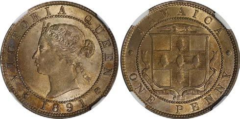1871. JAMAICA, copper-nickel penny, Victoria I, 1885, NGC MS 63, ex-Rudman. KM-17. One of just three in the NGC census with one finer in MS 64. Well struck and very lustrous with peach toning all over. NGC #3236045-062. Pedigreed to the Isaac Rudman Collection (stated on label). Estimate: $125-$200.