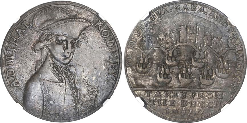 1926. GREAT BRITAIN, brass medal, 1781, Admiral G.B. Rodney / Capture of St. Eustatius, NGC VF details / obv scratched, ex-Rudman. BHM-235. 35 mm. Popular larger-size medal commemorating Admiral Rodney’s capture of Saint Eustatius from the Dutch and munitions meant for George Washington’s army. Fairly worn but detailed with some brassy luster around the design. NGC #6097547-015. Pedigreed to the Isaac Rudman Collection (stated on label). Estimate: $200-$300.