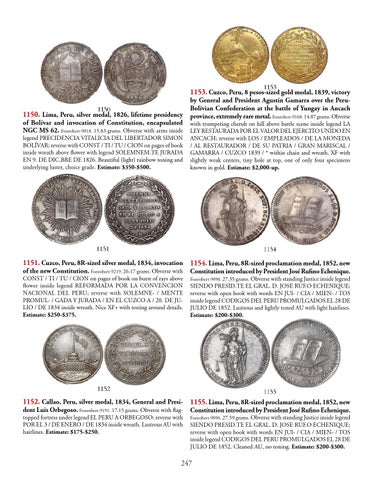 with trumpeting cherub on hill above battle scene inside legend LA LEY RESTAURADA POR EL VALOR DEL EJERCITO UNIDO EN ANCACH; reverse with LOS / EMPLEADOS / DE LA MONEDA / AL RESTAURADOR / DE SU PATRIA / GRAN MARISCAL / GAMARRA / CUZCO 1839 / * within chain and wreath. XF with slightly weak centers, tiny hole at top, one of only four specimens known in gold. Estimate: $2,000-up.