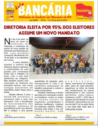 www.bancariosrn.com.br 26 a 31 de dezembro de 2022 bancáriaLuta 03 março abril VIGILANTES DO RN INICIAM GREVE SINDICATO E CONCURSADOS COBRAM DA SUPERINTENDÊNCIA DA CAIXA NO RN CONVOCAÇÃO DE NOVOS EMPREGADOS MULHERES CONTRA O MACHISMO, O RACISMO E A VIOLÊNCIA E PELO FORA BOLSONARO TRABALHADOR RECEBE DIFERENÇAS PELO FIM DE PARCELA PAGA POR VENDAS DE PRODUTOS BANCÁRIOS PARA O SINDSAÚDE PERMANECER NO CAMPO DA LUTA, TODO NOSSO APOIO À CHAPA 1 BANCÁRIO DO ITAÚ CONQUISTA NA JUSTIÇA RECONHECIMENTO DE BURNOUT COMO ACIDENTE DE TRABALHO DIRETORIA ELEITA POR 95% DOS ELEITORES ASSUME UM NOVO MANDATO ENCONTRO DA FNOB REUNIRÁ BANCÁRIOS DO PAÍS EM NATALDIAS 14 E 15 DE MAIO PARA A FUNCEF, VOTE CONTRA OS CANDIDATOS DO GOVERNO BOLSONARO E DA BUROCRACIA DA CONTRAF/CUT, VOTE EM COLEGAS COM INDEPENDÊNCIA E NA DEFESA DA CAIXA E DA NOSSA PREVIDÊNCIA
