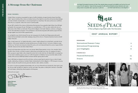 Dear Friends: At Seeds of Peace, we empower young people from regions of conflict to be leaders and agents of positive change. We call them “Seeds.” Against a backdrop of fear, mistrust, and violence, the story of how Seeds from around the world overcome these challenges and evolve into leaders and peacemakers is a source of great hope for our shared future. Their stories are the ones we would like to share with you, our supporters, without whom none of it would be possible. The year 2007 marked the 15th anniversary of the founding of the International Camp operated by Seeds of Peace. Some 320 Seeds participated in the camp program this year. What began as an improbable dream in 1993 was made a reality by the vision and determination of John Wallach, our late founder. That year the first delegation of 46 Israelis, Palestinians, Jordanians, and Egyptians arrived in the United States to participate in what would become an internationally recognized conflict resolution program that drew teenagers together, face to face with their supposed enemies.