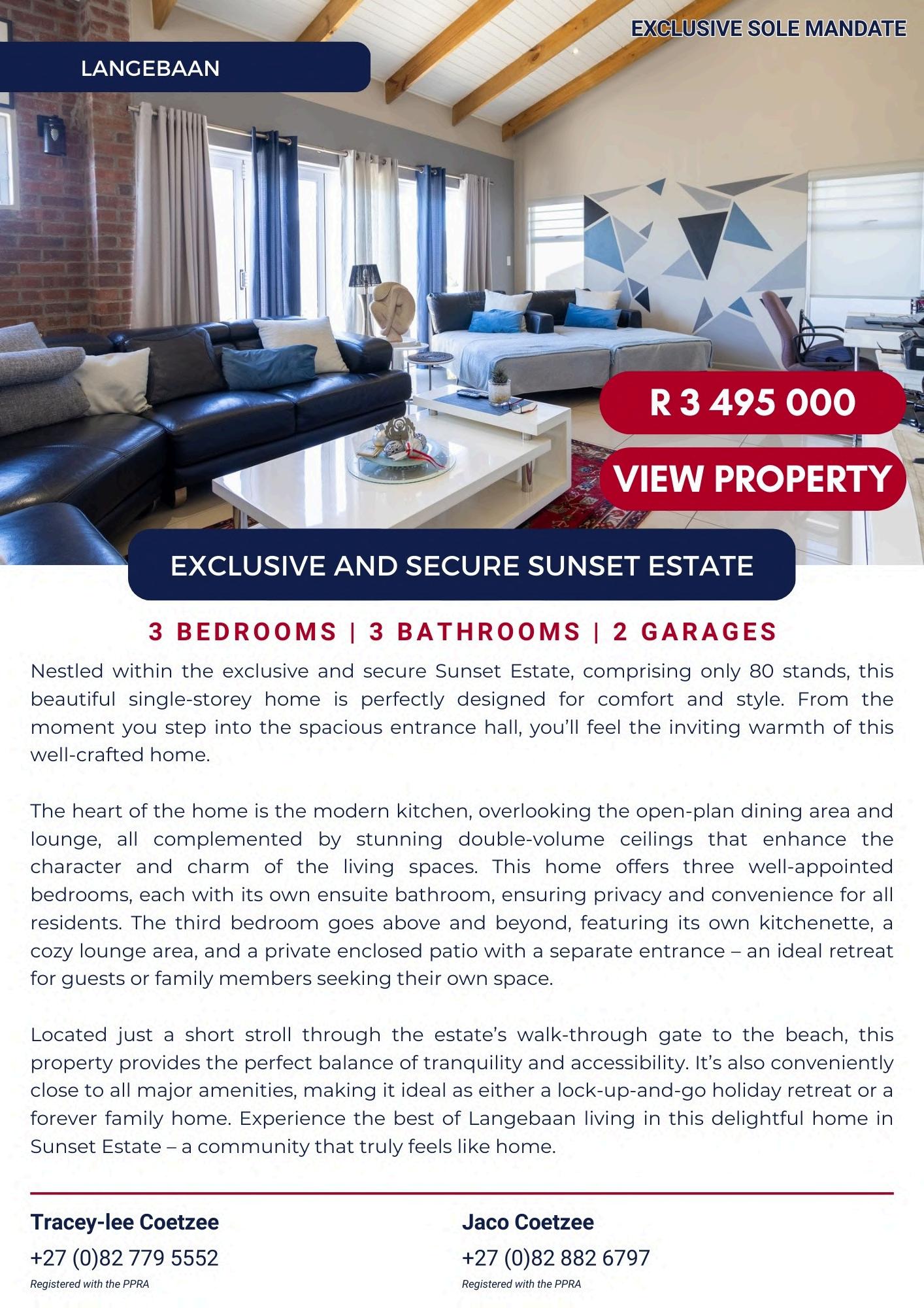 Overall, this is a high-quality, finished home that offers a luxurious coastal lifestyle in a secure and environmentally conscious setting. With its openplan design, natural light, and beautiful views, this property is perfect for families who enjoy entertaining and appreciate the beauty of nature. Contact your agent today to arrange a viewing and experience the magic of Jakkalsfontein for yourself. Key features include a stunning ocean and fynbos view and a double-story house with open-plan living.