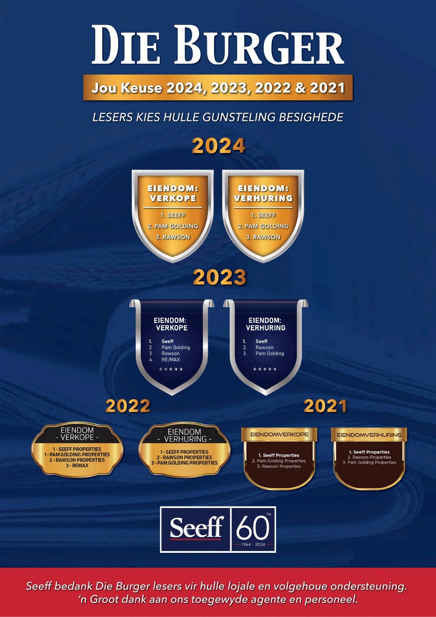 Imagine waking up to the peaceful sounds of the Koornlands River right on your doorstep. This isn't just a house; it's a spacious 4-bedroom family home designed for a life of comfort and tranquility. Situated on a 2001m² plot, it offers the perfect escape while still being close to everything. The heart of the home is the open-plan living area, step outside onto the undercover patio with a built-in braai, all while overlooking the established garden and sparkling pool.