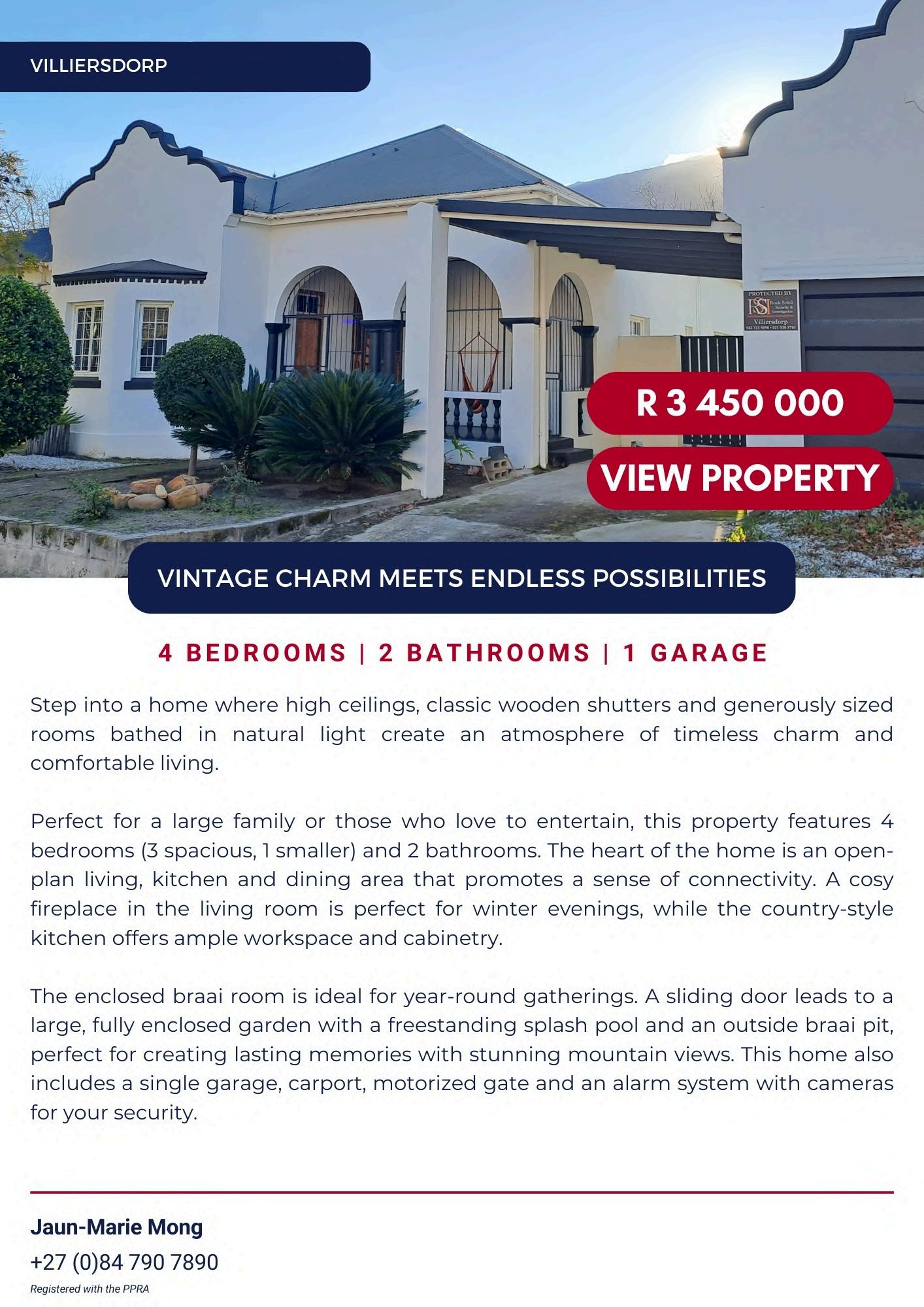 This spacious home beautifully combines old-world charm with modern convenience, offering the perfect setting for family living or the extended family with a bachelor flat. Ideally located in a peaceful area, it’s a rare find with endless potential. Large Enclosed Garden – perfect for children and pets. The yard is fully fenced with a remote gate at the entrance. Double Garage & Covered Parking –ensuring ample space for vehicles and storage